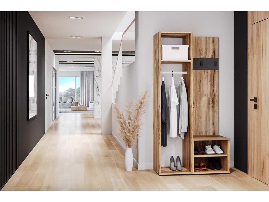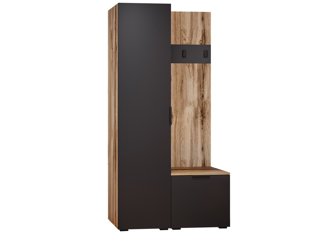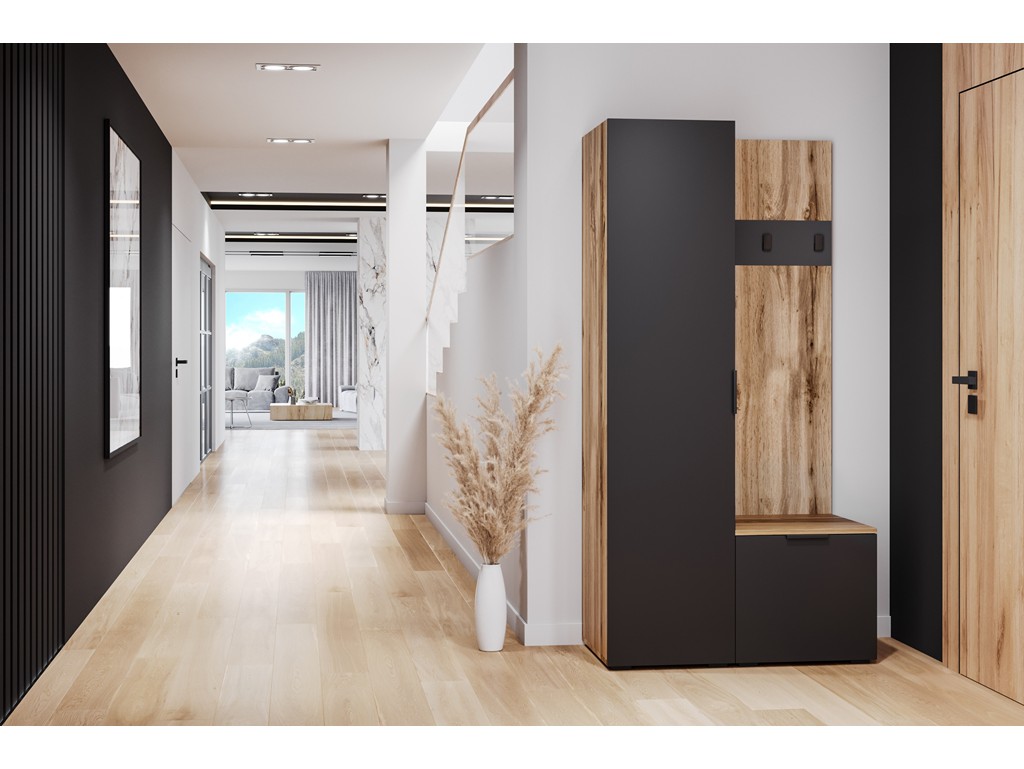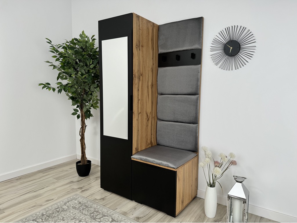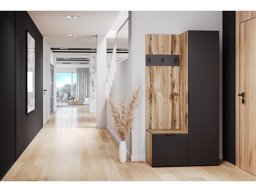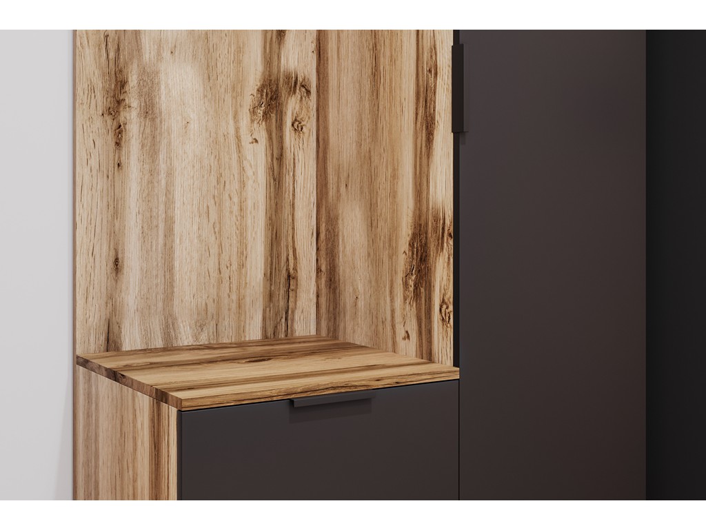 Wnęka z siedziskiem zwiększa komfort przy zakładaniu obuwia, a kolorystyka czerni i dębu wotan świetnie pasuje do wnętrz loftowych i industrialnych.