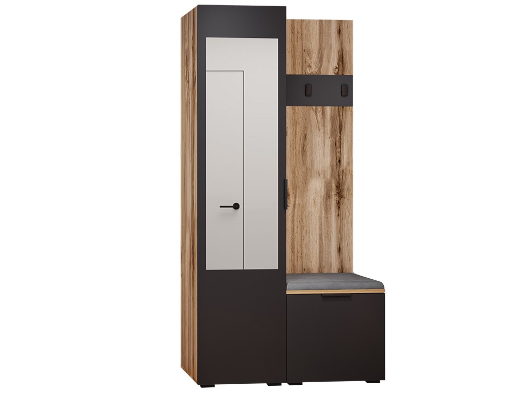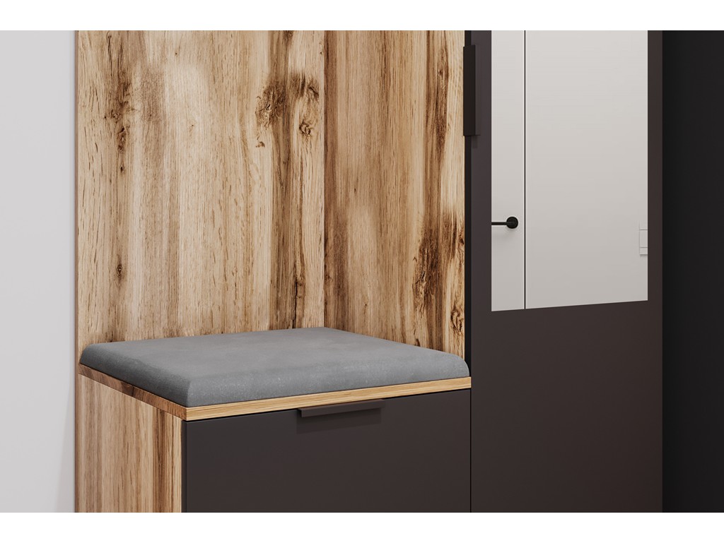 Szafa garderoba Lomi 2 z lustrem to nowoczesny i funkcjonalny mebel do mniejszego przedpokoju. Wnęka z tapicerowaną poduszką w szarym welurze zapewnia wygodne siedzisko przy zakładaniu obuwia, a front z lustrem optycznie powiększa przestrzeń.