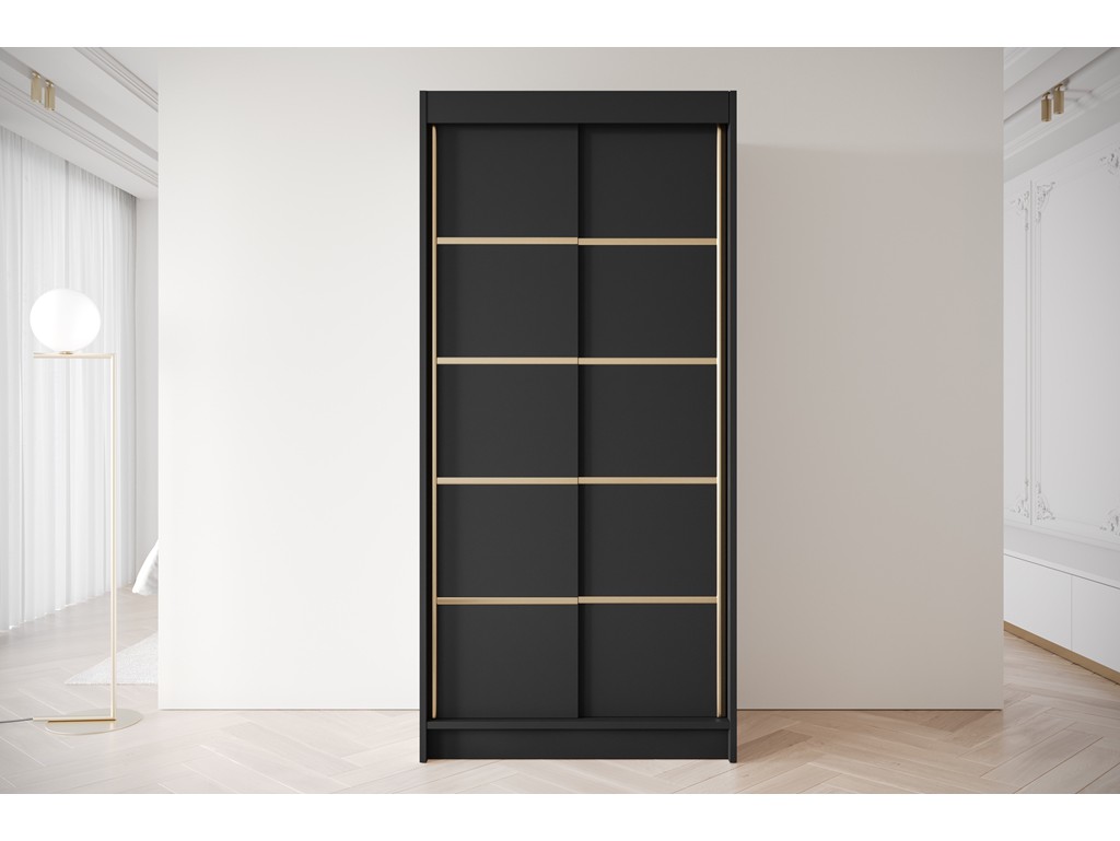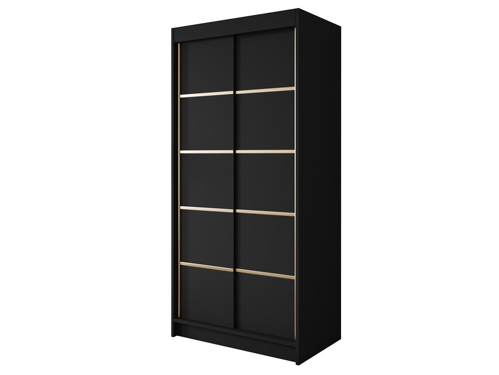 Szafa przesuwna Gold 4 czarna 100 cm to elegancki i praktyczny mebel do sypialni, garderoby lub pokoju młodzieżowego. Czarne fronty ozdobione złotymi wstawkami nadają całości nowoczesnego charakteru, a system drzwi przesuwnych pozwala zaoszczędzić miejsce i zapewnia wygodne użytkowanie.