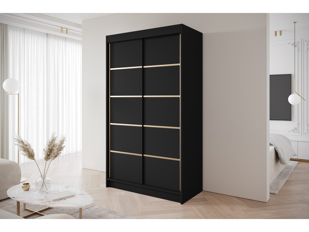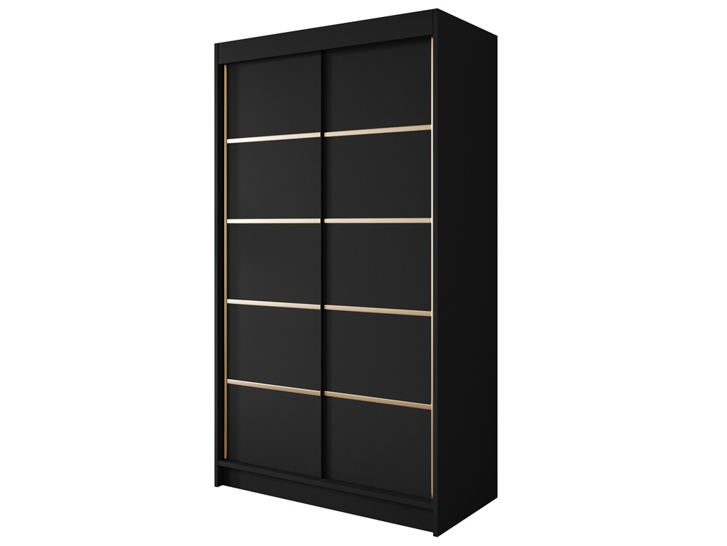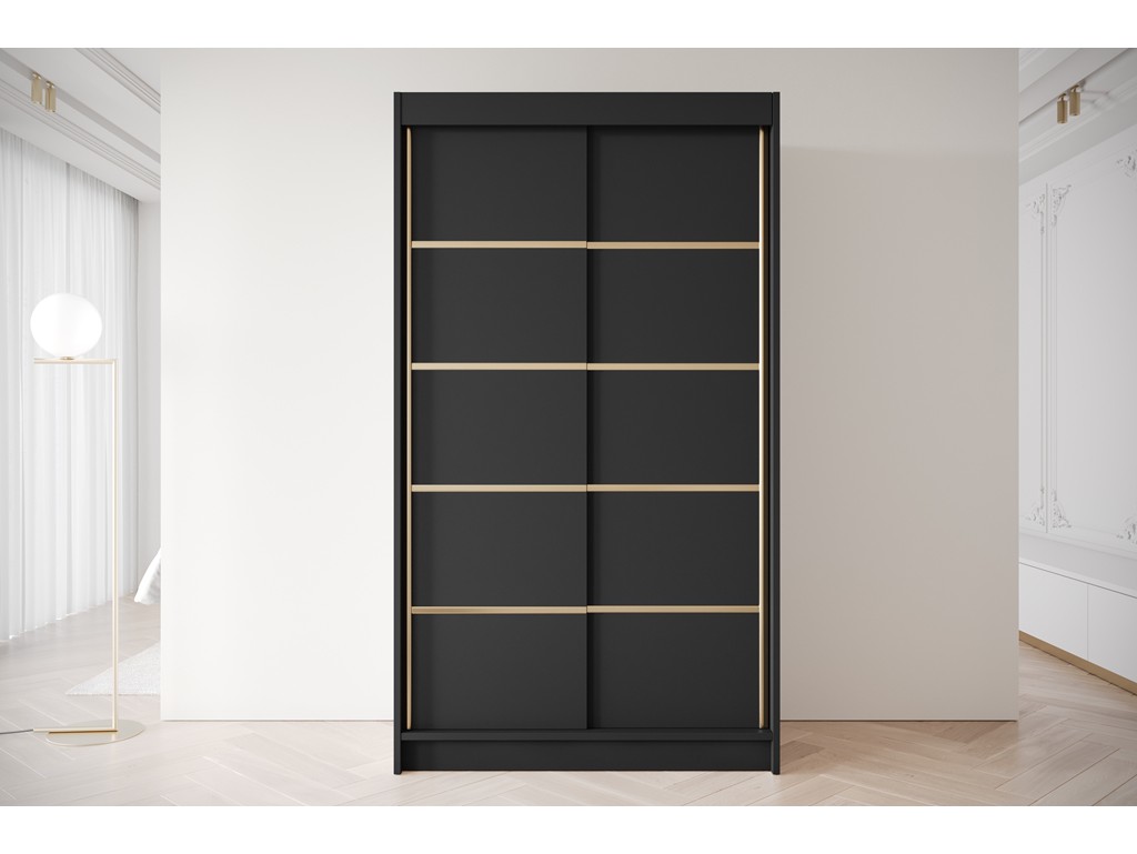 Szafa przesuwna Gold 4 czarna 120 cm to nowoczesny i elegancki mebel, idealny do średnich i większych pomieszczeń. Drzwi przesuwne ułatwiają korzystanie w pokojach o ograniczonej przestrzeni, a czarny mat w połączeniu ze złotymi wstawkami nadaje wnętrzu luksusowego charakteru. Dostawa realizowana w 5-12 dni roboczych. ⟵Zobacz całą kolekcję szaf Gold