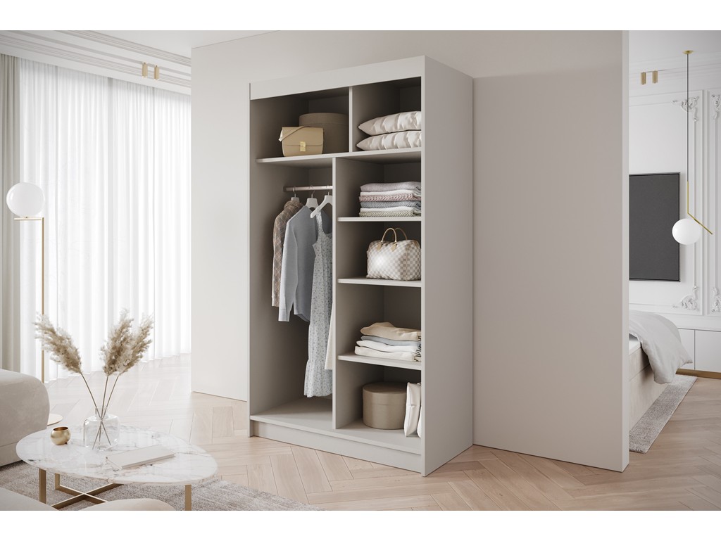 Drzwi przesuwne ułatwiają codzienne użytkowanie nawet w wąskich pokojach, a pojemne wnętrze umożliwia wygodne przechowywanie ubrań i dodatków.
