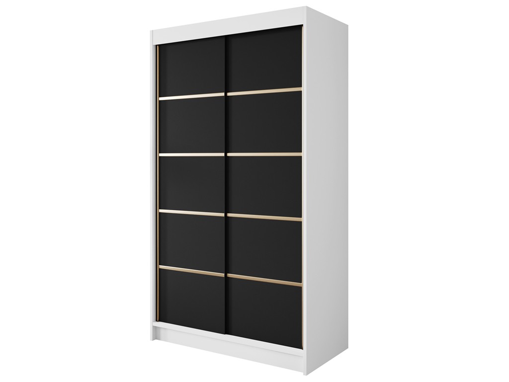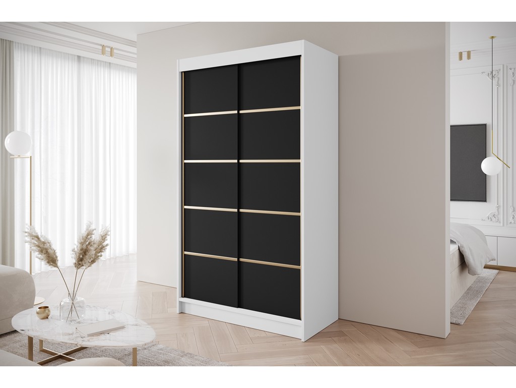 Szafa przesuwna Gold 4 biały/czarny 120 cm to nowoczesny mebel do średnich pomieszczeń. Czarny front ze złotymi wstawkami w połączeniu z białym korpusem tworzy stylowy kontrast, a drzwi przesuwne umożliwiają wygodne użytkowanie nawet w wąskich przestrzeniach. Praktyczne wnętrze z półkami i drążkiem zapewnia komfort przechowywania, a montaż jest prosty i szybki. ⟵Zobacz całą kolekcję szaf Gold