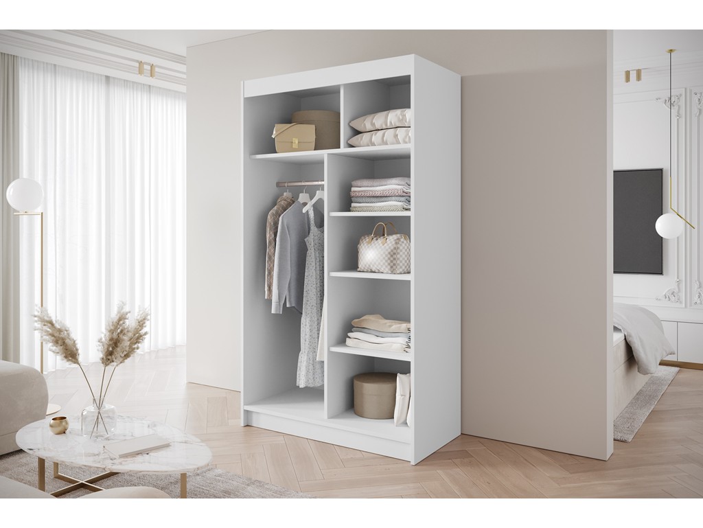 Drzwi przesuwne sprawiają, że szafa idealnie nadaje się do średnich i wąskich pomieszczeń, a solidna konstrukcja zapewnia długotrwałe użytkowanie.