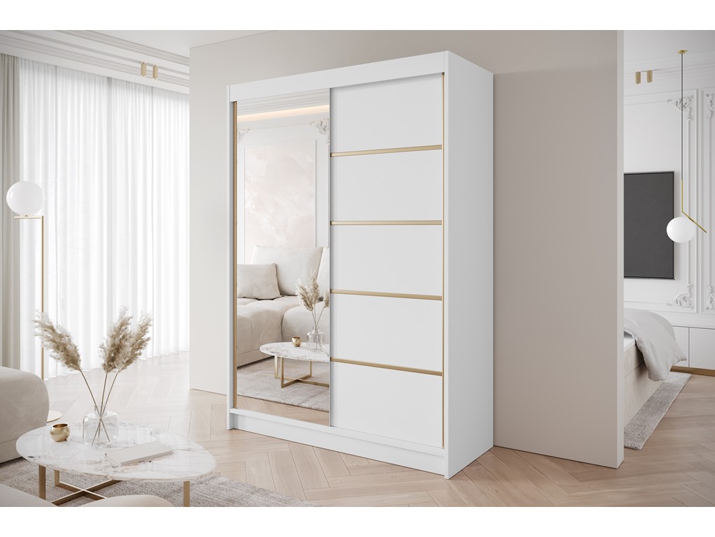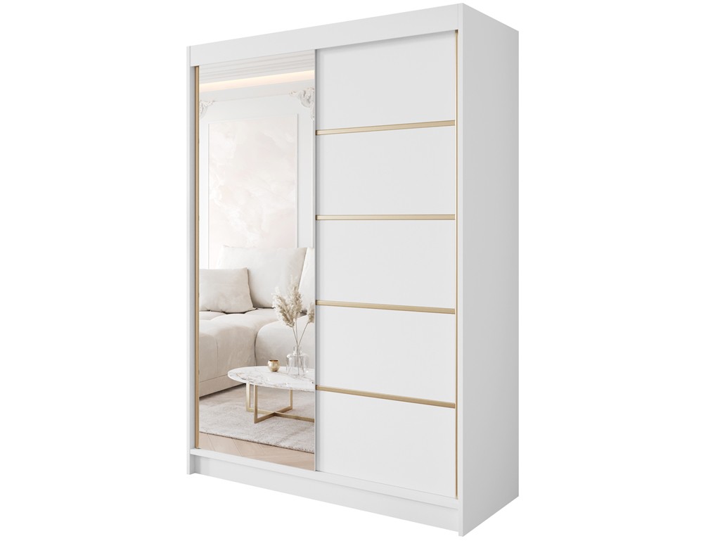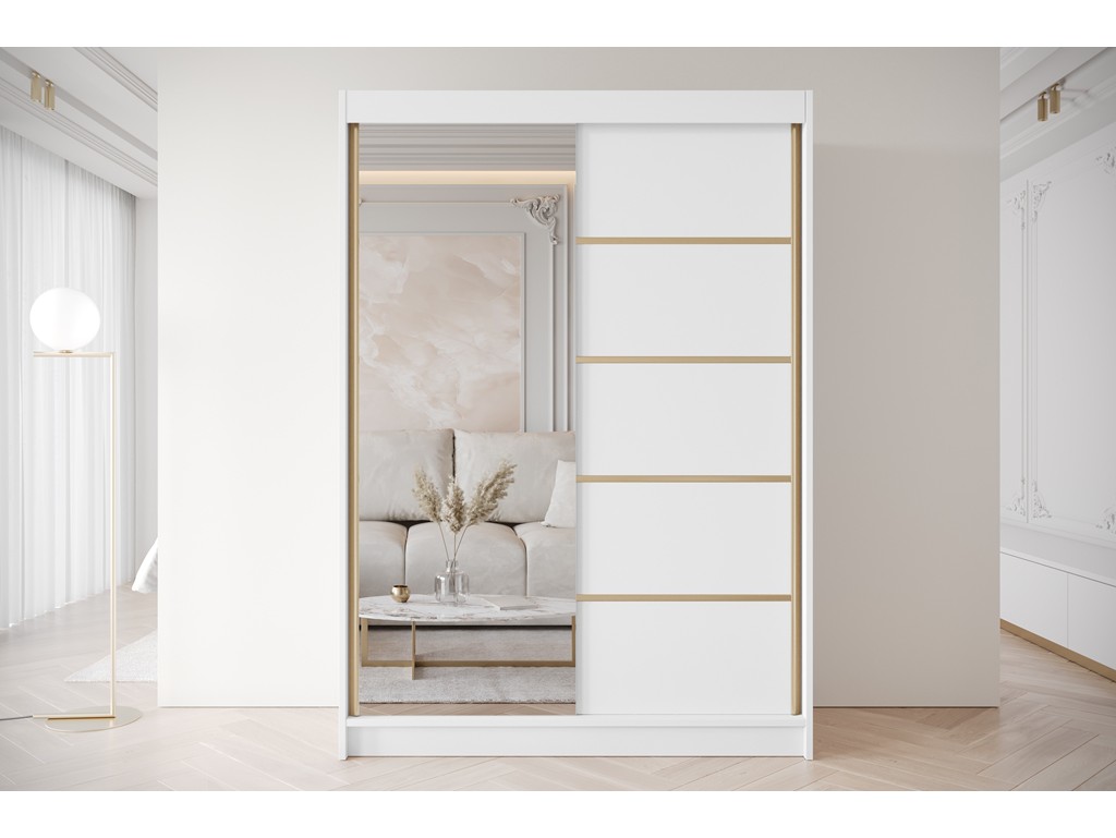 Szafa przesuwna Gold 3 150 biała z lustrem to kompaktowy mebel do sypialni lub pokoju gościnnego. Biały korpus i fronty ze złotymi wstawkami wprowadzają elegancki akcent, a lustro optycznie powiększa przestrzeń. Praktyczne wnętrze i łatwy montaż czynią ją funkcjonalnym rozwiązaniem do mniejszych pomieszczeń.