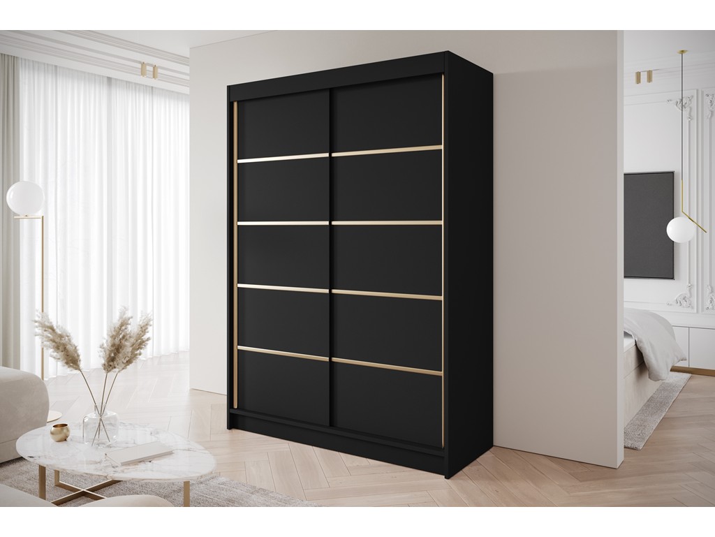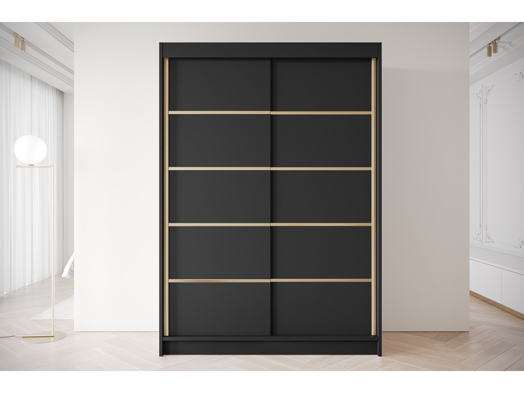 Szafa przesuwna Gold 4 czarna 150 cm to elegancki i pojemny mebel do sypialni lub garderoby. Czarny matowy front ze złotymi detalami wprowadza nowoczesny i luksusowy charakter, a drzwi przesuwne zapewniają wygodę użytkowania i oszczędność miejsca. Dostawa 5-12 dni roboczych.⟵Zobacz całą kolekcję szaf Gold