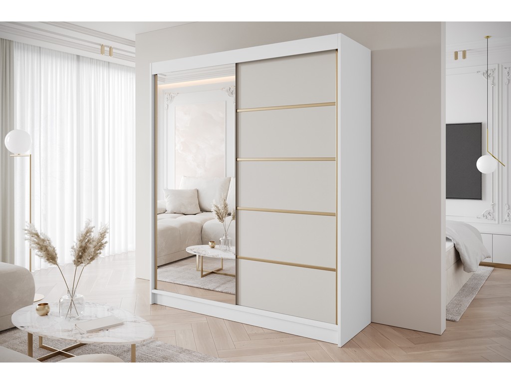Szafa przesuwna Gold 3 180 biały/kaszmir z lustrem to elegancki mebel do sypialni lub garderoby. Biały korpus w połączeniu z kaszmirowymi frontami i złotymi wstawkami tworzy harmonijny, nowoczesny efekt. Lustro optycznie powiększa wnętrze, a drzwi przesuwne oszczędzają miejsce w pomieszczeniu. Dostawa 5-12 dni roboczych. ⟵Zobacz całą kolekcję szaf Gold