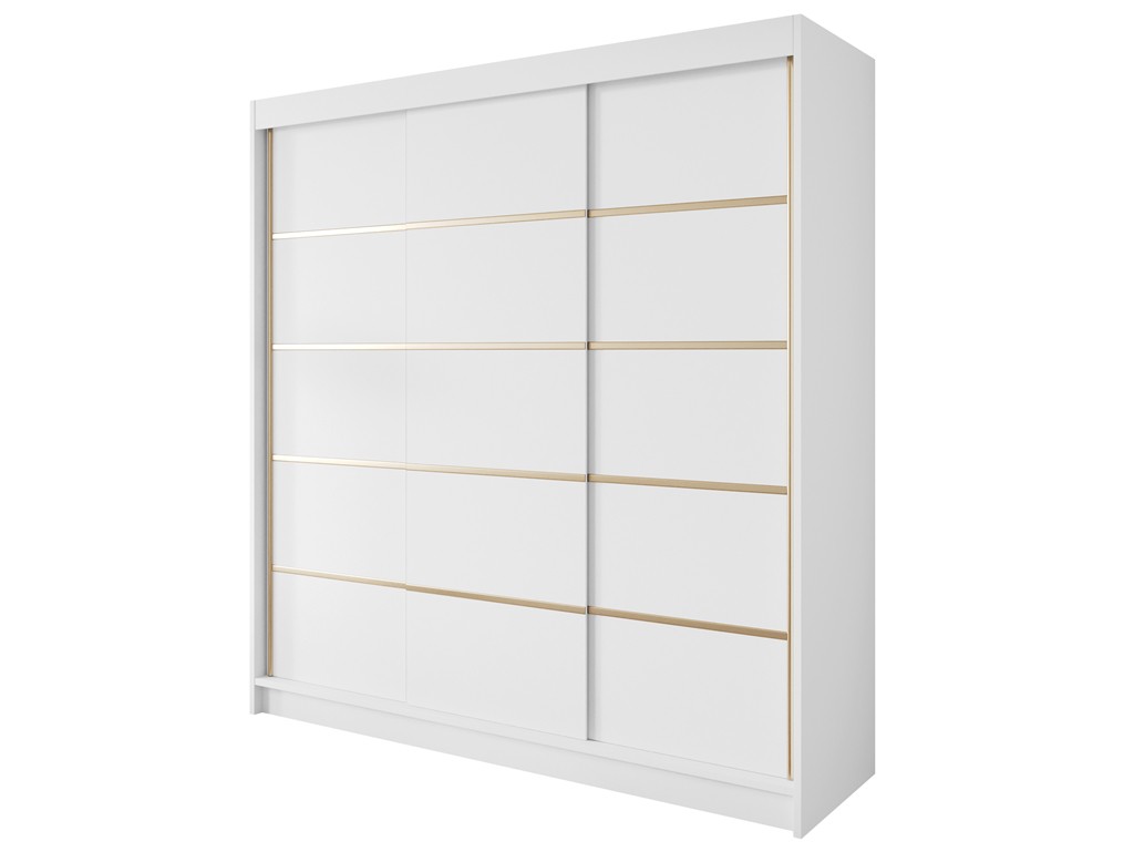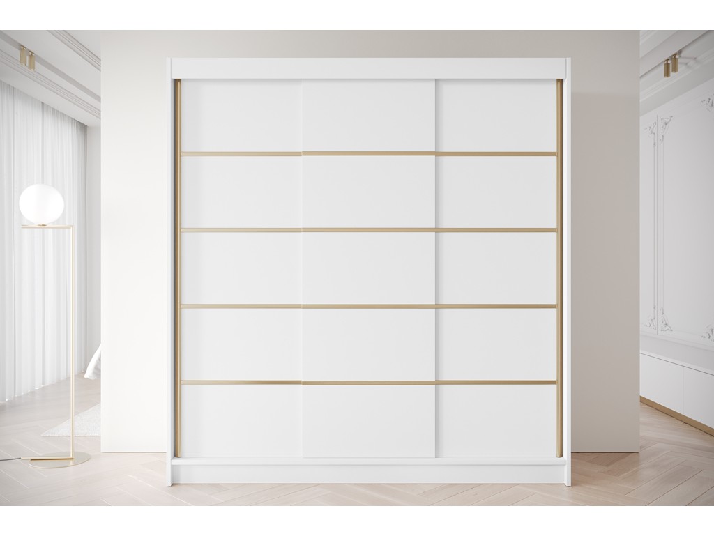 Szafa przesuwna Gold 7 200 biała to przestronny mebel do sypialni, idealny dla dwóch osób lub dużego pokoju. Troje drzwi przesuwnych oraz pojemne wnętrze z półkami i drążkami umożliwiają wygodne przechowywanie ubrań. Biały kolor z subtelnymi złotymi wstawkami tworzy elegancki i ponadczasowy efekt.