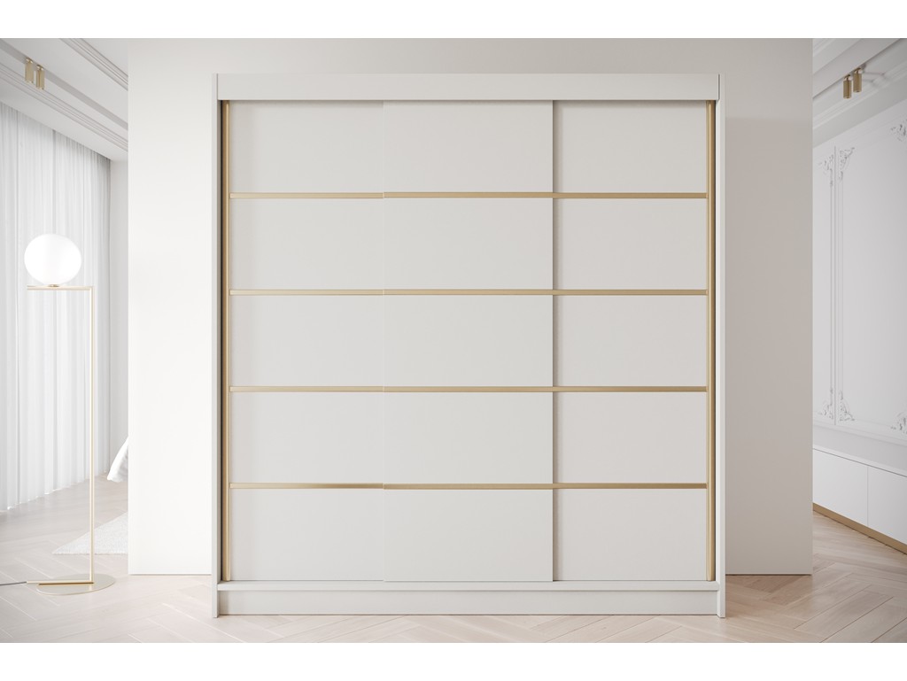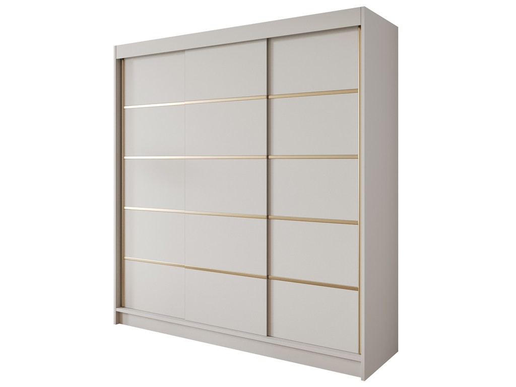 Szafa przesuwna Gold 7 200 kaszmir to nowoczesny i pojemny mebel do sypialni lub garderoby. Kaszmirowe fronty ze złotymi wstawkami nadają elegancki charakter, a trzy drzwi przesuwne pozwalają wygodnie korzystać z całej przestrzeni szafy. Wnętrze z półkami i drążkami zapewnia funkcjonalność, a mebel dostarczany jest do samodzielnego montażu z kompletem elementów. ⟵Zobacz całą kolekcję szaf Gold