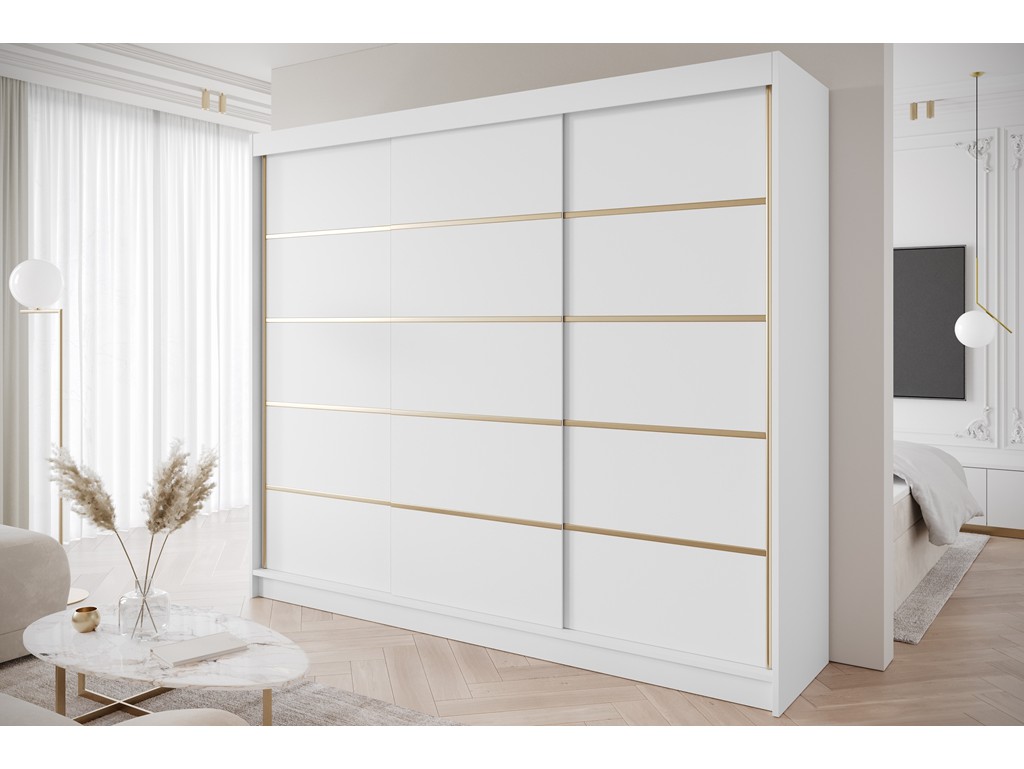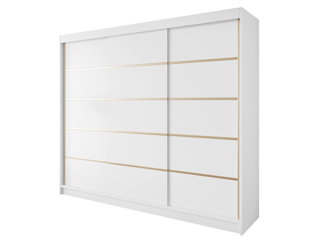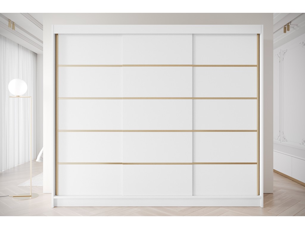 Szafa przesuwna Gold 7 250 biała to nowoczesny, pojemny mebel do sypialni lub garderoby. Gładkie białe fronty ze złotymi wstawkami rozjaśniają wnętrze i wprowadzają lekkość, a trzy drzwi przesuwne zapewniają wygodny dostęp do całej zawartości. Model dostarczany jest w formie do samodzielnego montażu, z czasem realizacji 5-12 dni roboczych. ⟵Zobacz całą kolekcję szaf Gold
