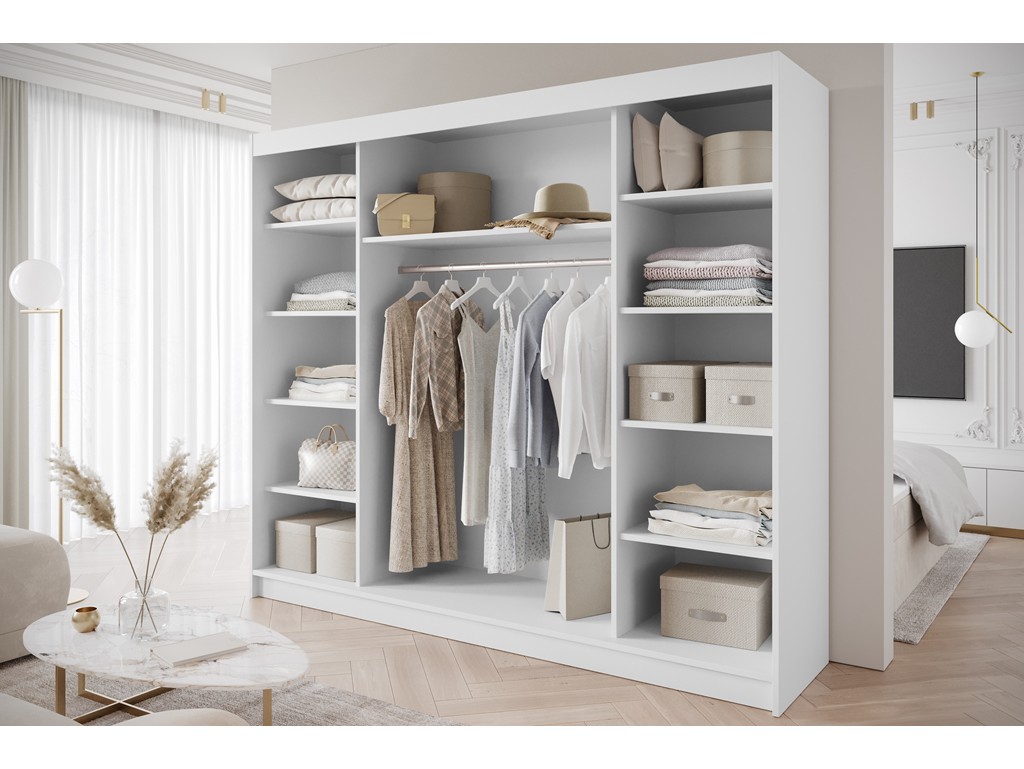 Szerokość 250 cm sprawia, że szafa sprawdzi się w większych sypialniach i garderobach, gdzie liczy się dobre rozplanowanie miejsca.