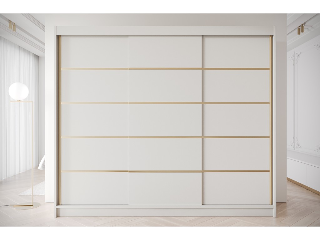 Szafa przesuwna Gold 7 250 cm w kolorze kaszmir to pojemny i elegancki mebel do sypialni, garderoby lub przedpokoju. Trzydrzwiowa konstrukcja, wykończenie w ciepłym beżowym odcieniu oraz złote wstawki tworzą spójną, nowoczesną estetykę. Model zapewnia wygodne przechowywanie i szybki czas realizacji 5-12 dni roboczych. ⟵Zobacz całą kolekcję szaf Gold