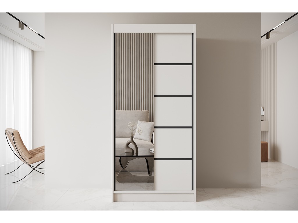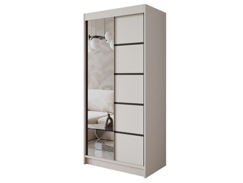 Szafa Nero 3 100 cm w kolorze kaszmir z lustrem to szafa przesuwna do nowoczesnej sypialni, garderoby lub przedpokoju. Ciepły, subtelny odcień beżu wprowadza harmonię i spokój, a lustro optycznie powiększa przestrzeń. Czarne listwy ozdobne dodają wyrazistego kontrastu, podkreślając elegancki charakter wnętrza.