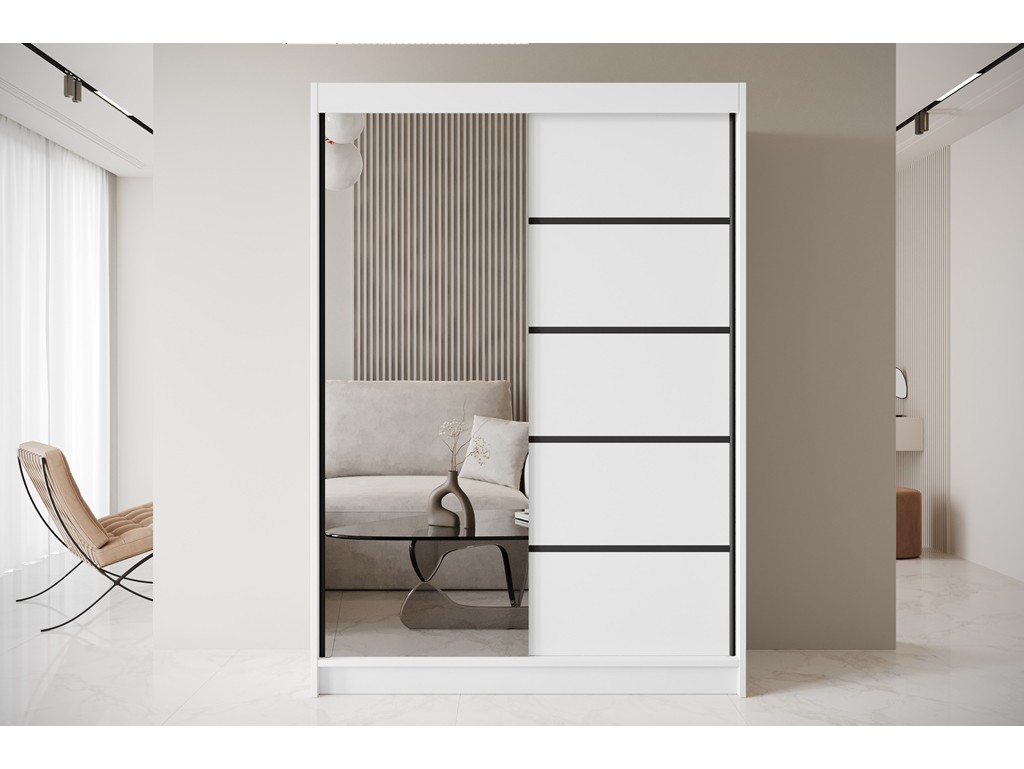 Pojemne wnętrze ułatwia segregację odzieży, a minimalistyczny biały front z czarnymi listwami wprowadza elegancki akcent do sypialni.