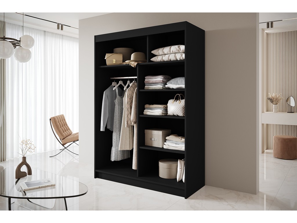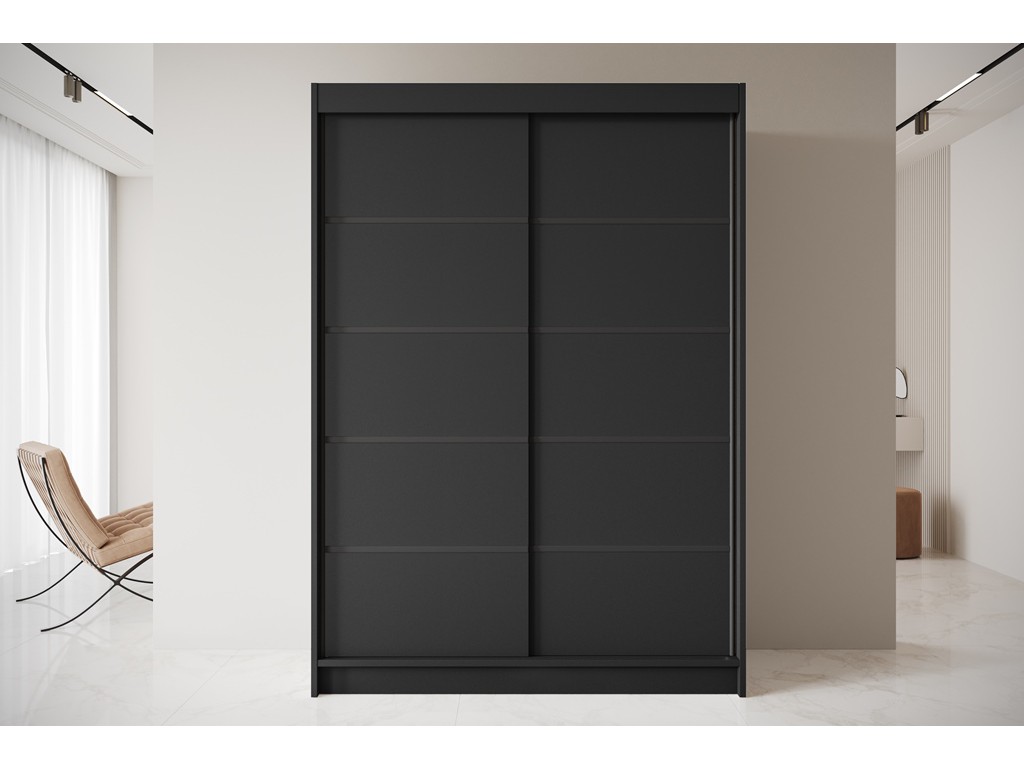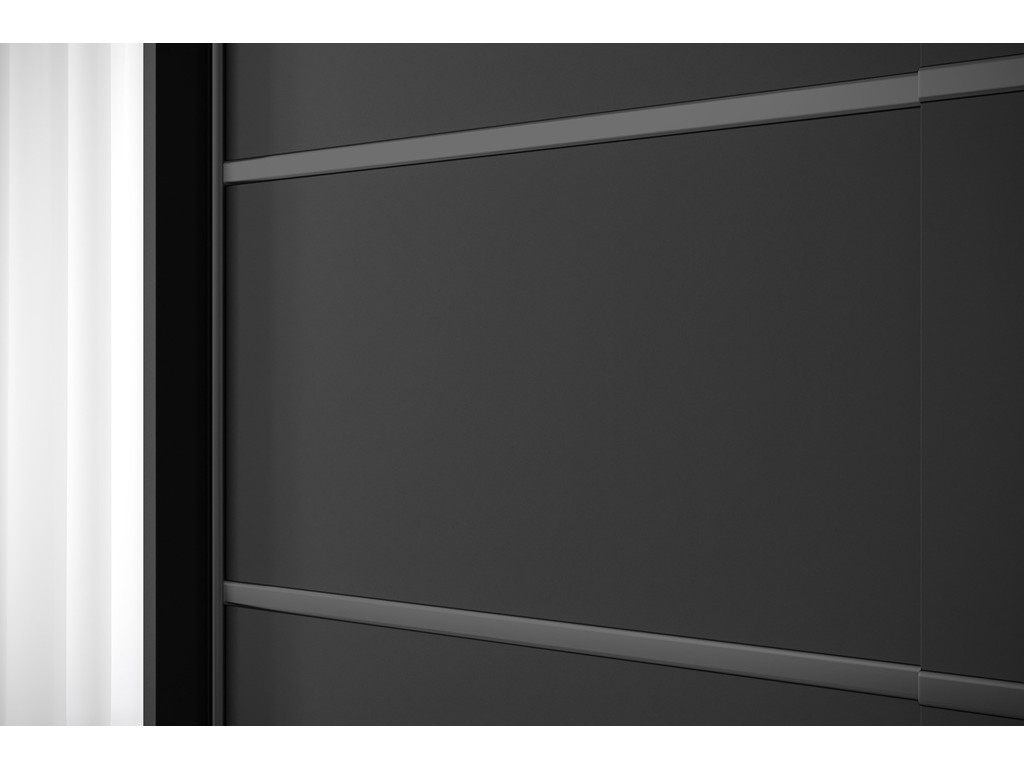 Szafa przesuwna Nero 4 w rozmiarze 150 cm w czarnym wykończeniu to elegancka i funkcjonalna propozycja do nowoczesnej sypialni. Matowy kolor i dekoracyjne listwy subtelnie przełamują jednolity front, tworząc uporządkowany efekt wizualny. Szerokość 150 cm zapewnia dużo miejsca na ubrania i akcesoria, a solidna konstrukcja gwarantuje trwałość użytkowania. ⟵Zobacz całą kolekcję szaf Nero