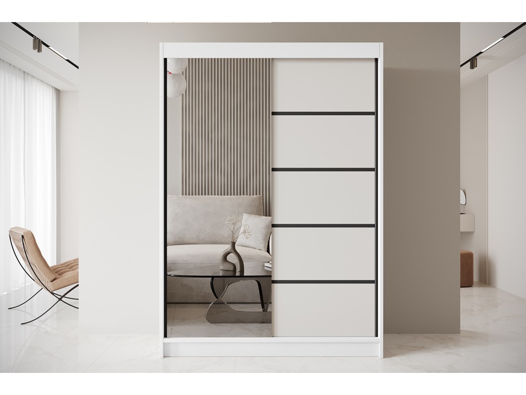 Szafa przesuwna Nero 3 w kolorze biały/kaszmir z lustrem w rozmiarze 150 cm to funkcjonalny mebel do nowoczesnej sypialni lub garderoby. Czarne listwy i lustro w pełnej wysokości optycznie powiększają przestrzeń i dodają elegancji. Wnętrze z półkami i drążkiem ułatwia organizację ubrań, a darmowa dostawa sprawia, że wyposażenie pokoju staje się szybkie i wygodne.