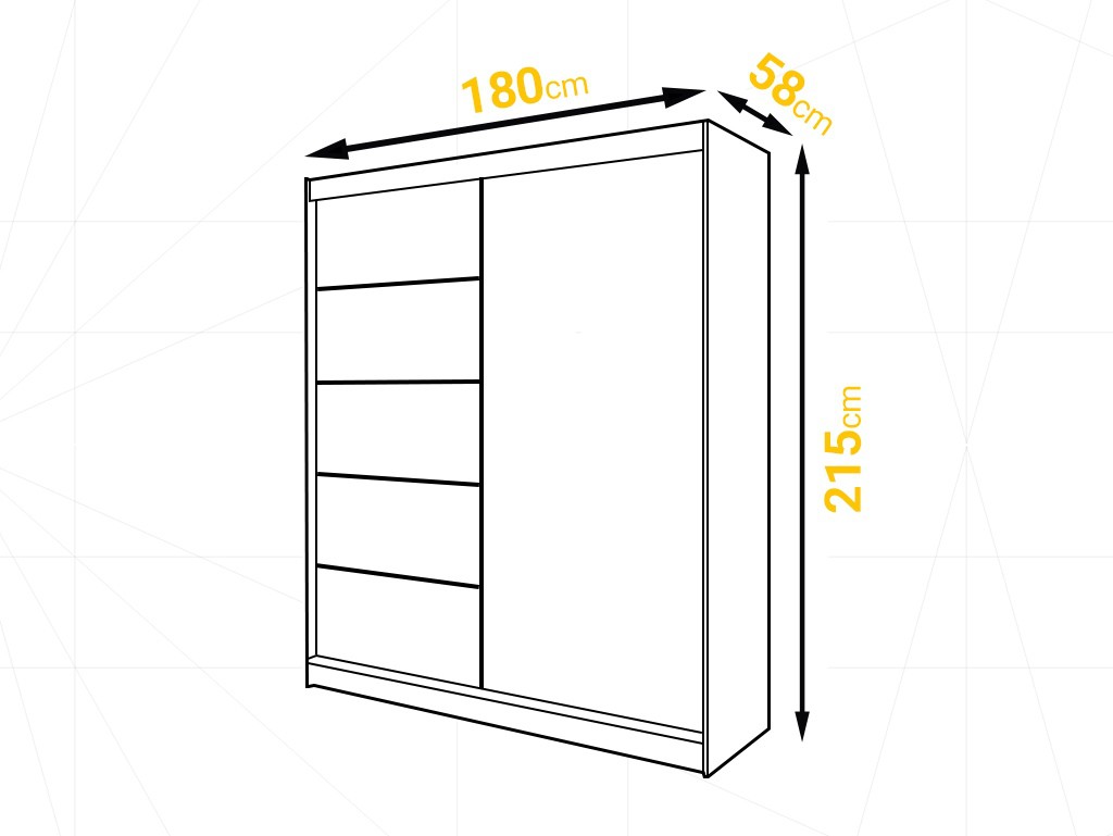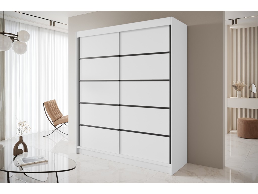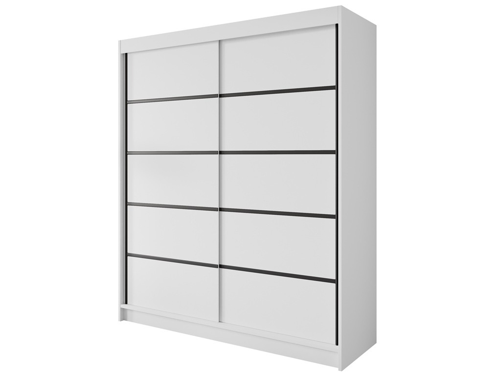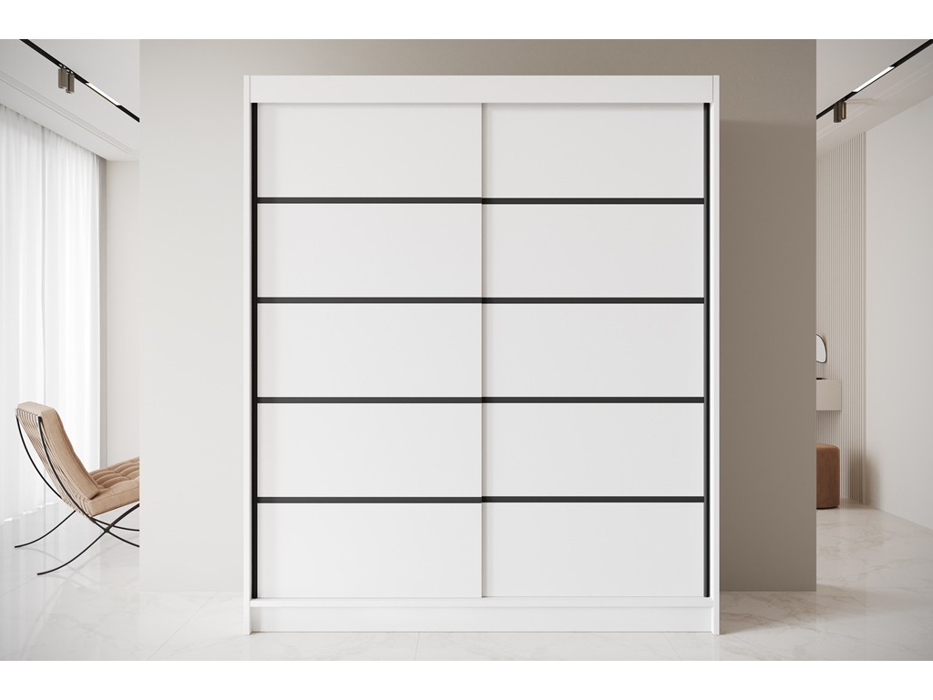 Szafa przesuwna Nero 4 w rozmiarz 180 cm w uniwersalnym białym kolorze łączy minimalistyczny design z praktycznym wnętrzem. Ozdobne czarne listwy nadają frontom elegancki charakter, a przestrzeń z półkami i drążkiem umożliwia wygodne przechowywanie ubrań. Dostawa jest darmowa i szybka, co pozwala szybko wyposażyć sypialnię lub garderobę.