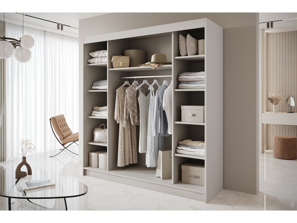 Szafa przesuwna Nero 7 w rozmiarze 200 cm to pojemny mebel do sypialni lub garderoby, w ciepłym, stonowanym odcieniu kaszmirowym. Drzwi przesuwne, półki pionowe, przegrody i drążek zapewniają logiczne rozplanowanie garderoby - od ubrań wiszących po akcesoria i dodatki.