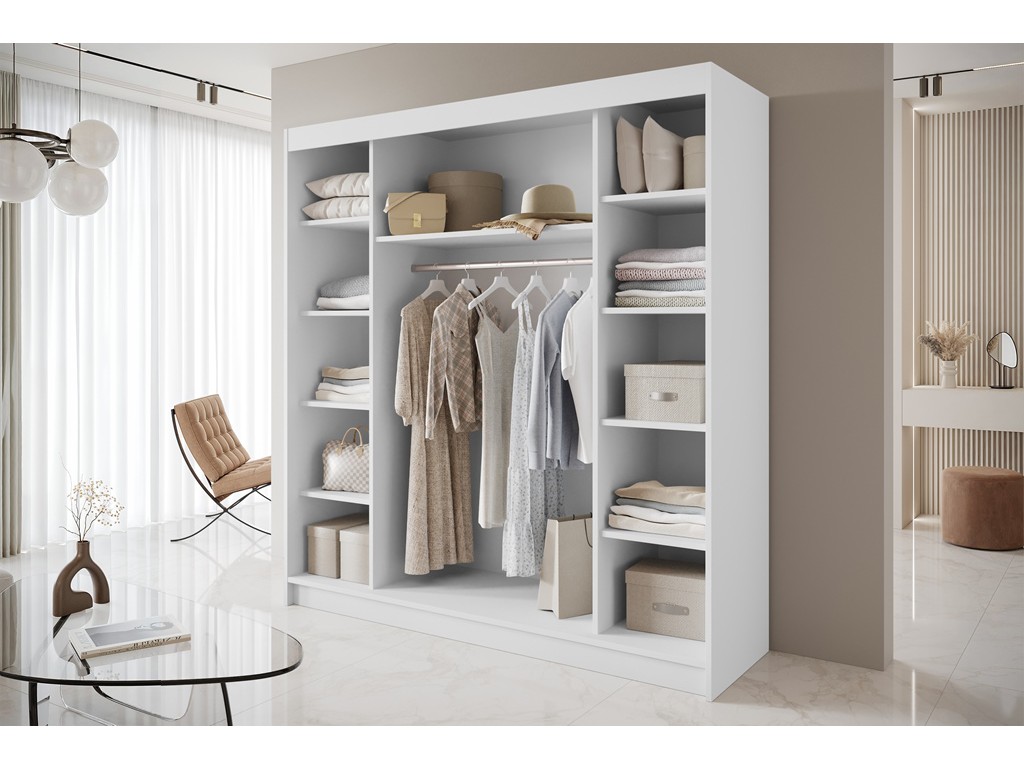 Lustro ułatwia codzienną organizację, a pojemne wnętrze z półkami i drążkiem pozwala przechowywać odzież w uporządkowany sposób.