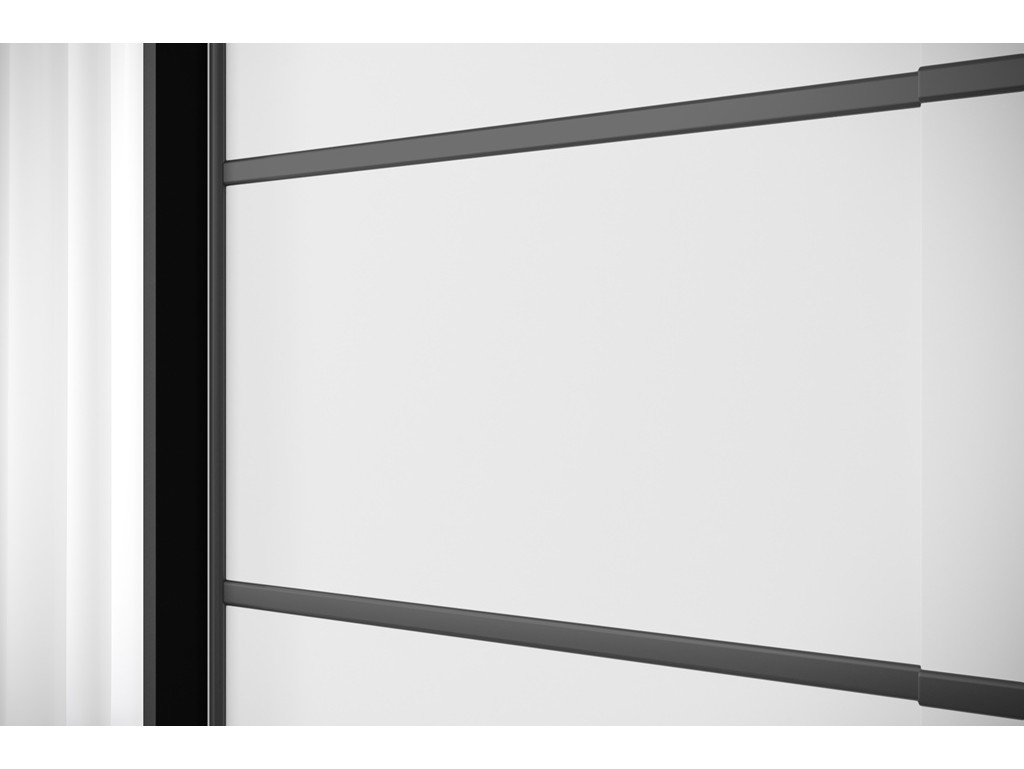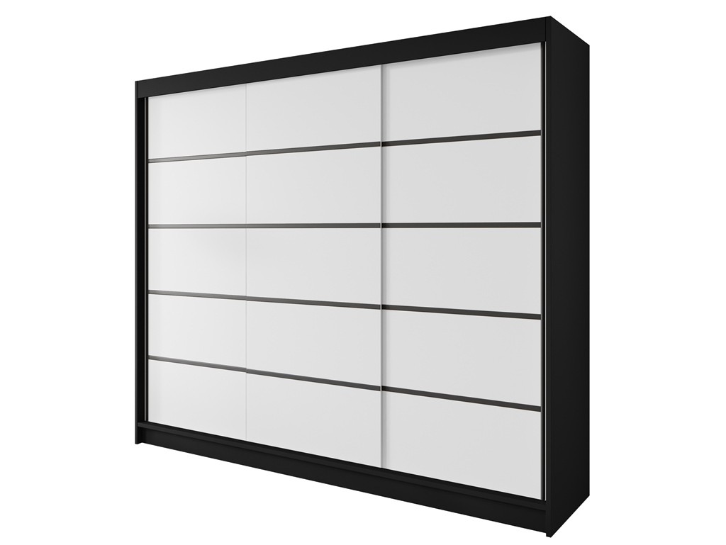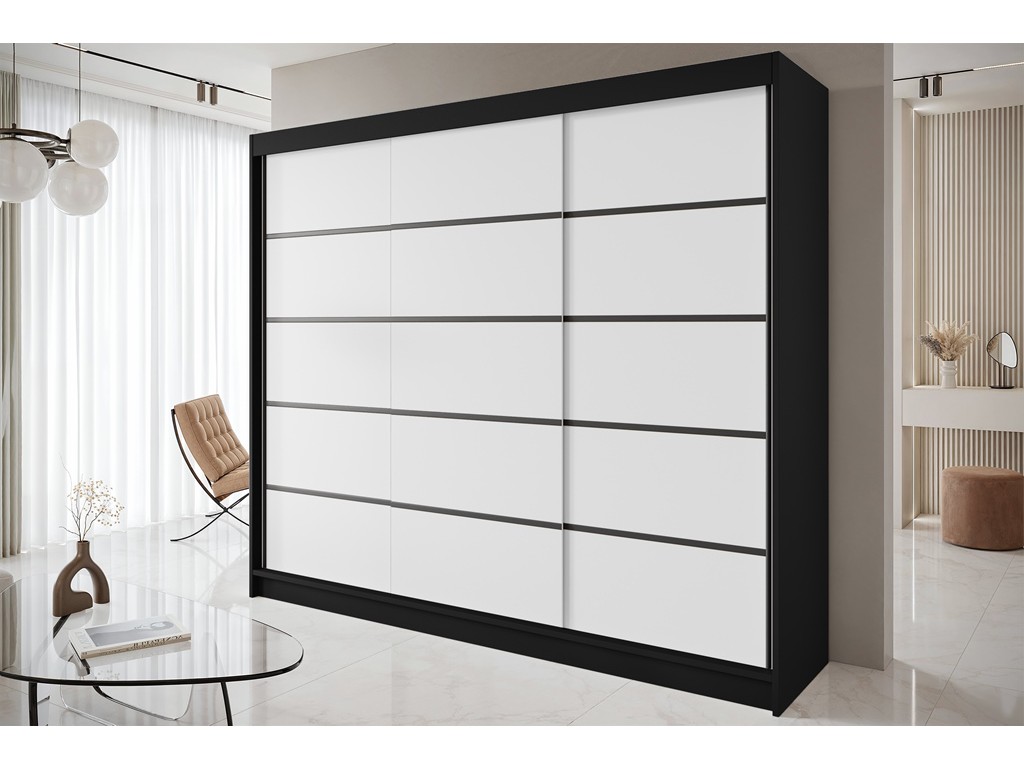 Szafa przesuwna Nero 7 w rozmiarze 250 cm w eleganckim odcieniu czarny/biały to przestronny mebel łączący eleganckie kontrastowe wykończenie z funkcjonalnością. Troje drzwi przesuwnych zapewnia wygodny dostęp do wnętrza z półkami, przegrodami i drążkiem na ubrania. Ozdobne czarne listwy podkreślają nowoczesny charakter szafy.