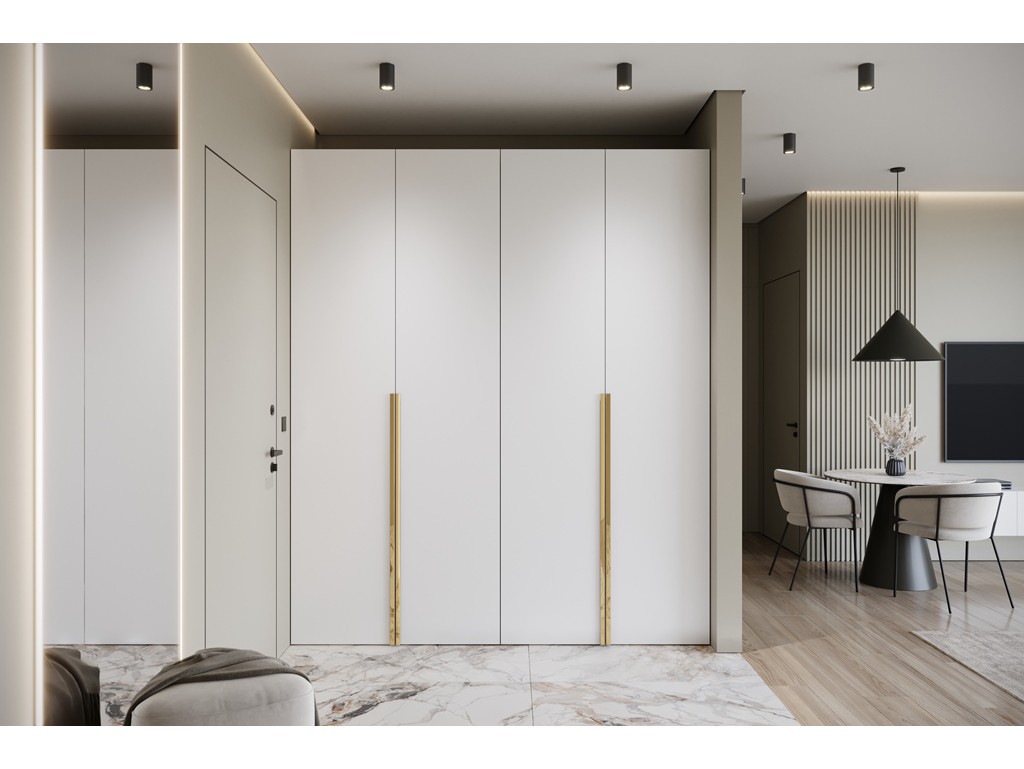 Jasny kolor optycznie powiększa przestrzeń, a złote uchwyty wprowadzają elegancki akcent.