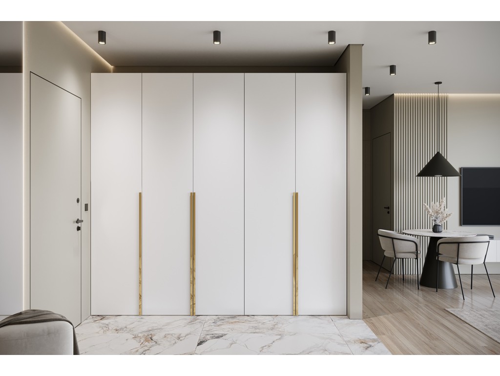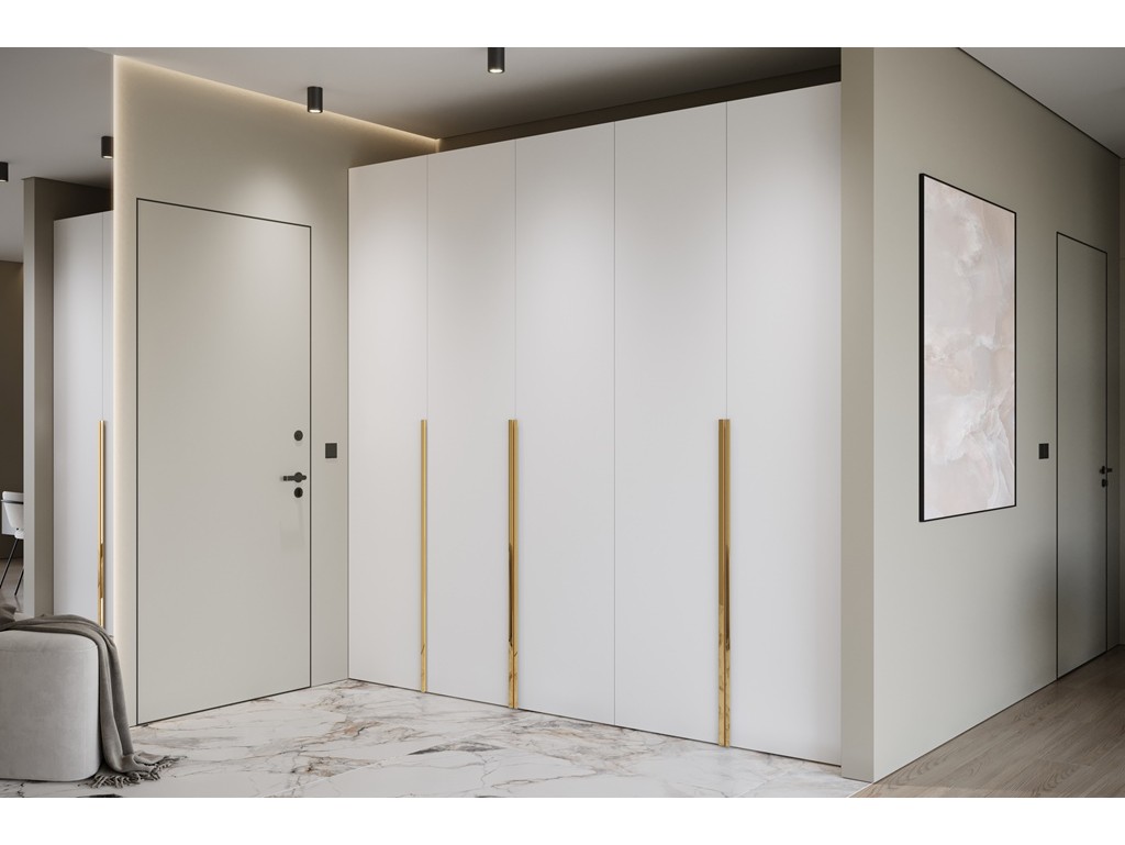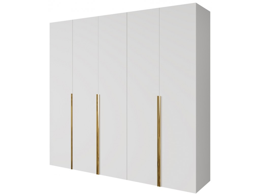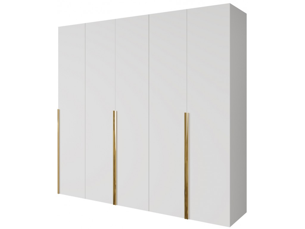 Szafa modułowa Alba 250 5D w kolorze białym ze złotymi uchwytami to przestronne i eleganckie rozwiązanie do dużych sypialni. Pięć frontów zapewnia wygodny dostęp do wnętrza, a modułowa konstrukcja pozwala na łączenie z innymi segmentami kolekcji. Dostawa 5-12 dni. ⟵Zobacz całą kolekcję szaf Alba