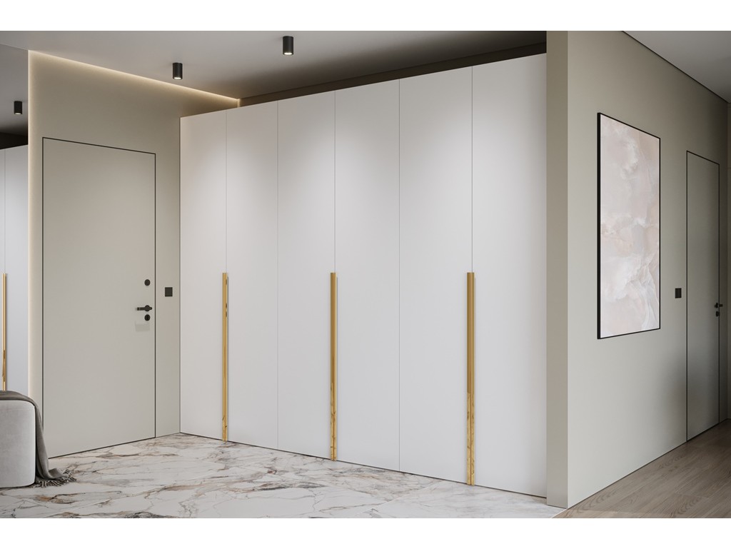 Szafa modułowa Alba 300 6D w kolorze białym ze złotymi uchwytami to eleganckie i pojemne rozwiązanie do nowoczesnej sypialni lub garderoby. Szeroki front i harmonijny design zapewniają komfortową organizację przestrzeni, a solidne wykonanie i montaż samodzielny gwarantują wygodę użytkowania. Dostawa standardowa 5-12 dni. ⟵Zobacz całą kolekcję szaf Alba