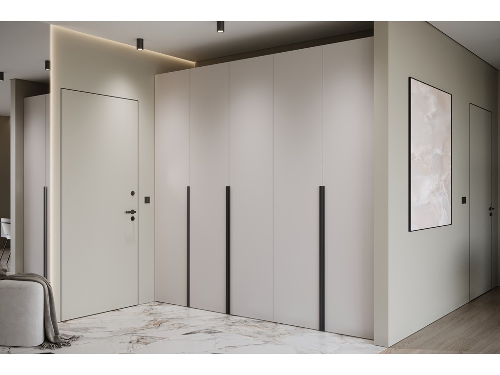 Szafa Alba 250 5D kaszmir z czarnymi uchwytami łączy estetykę z funkcjonalnością, pozwalając zachować porządek w dużych wnętrzach.