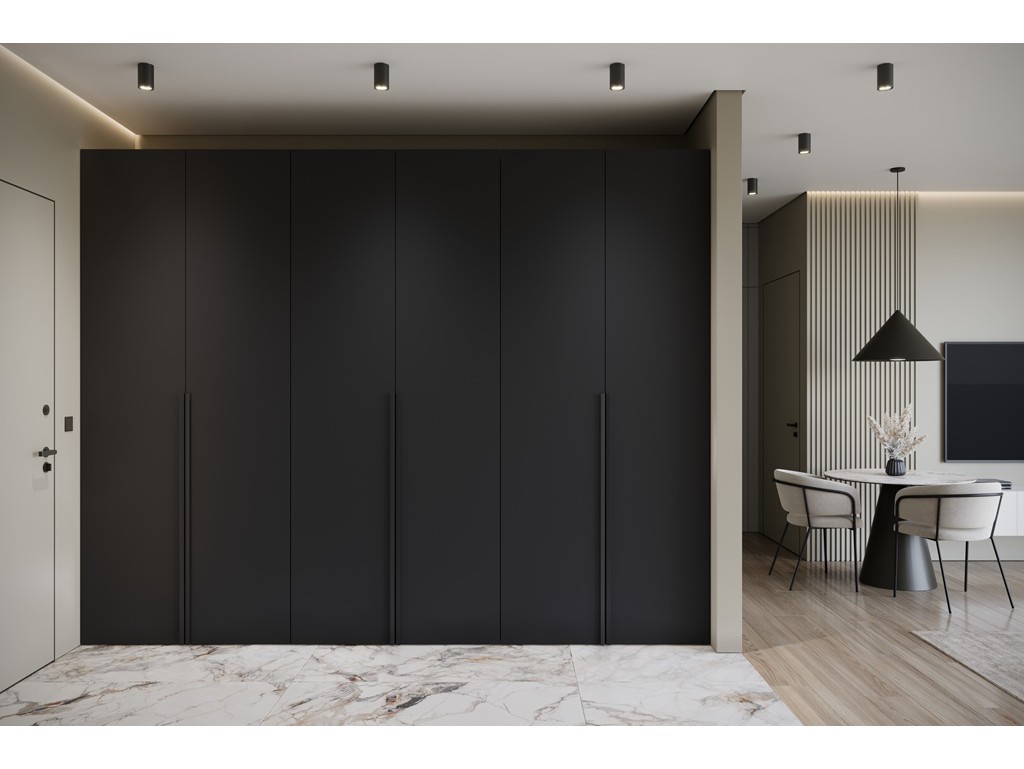 Przestronne wnętrze umożliwia wygodne przechowywanie odzieży i dodatków, a matowa czerń komponuje się z nowoczesnymi aranżacjami wnętrz.