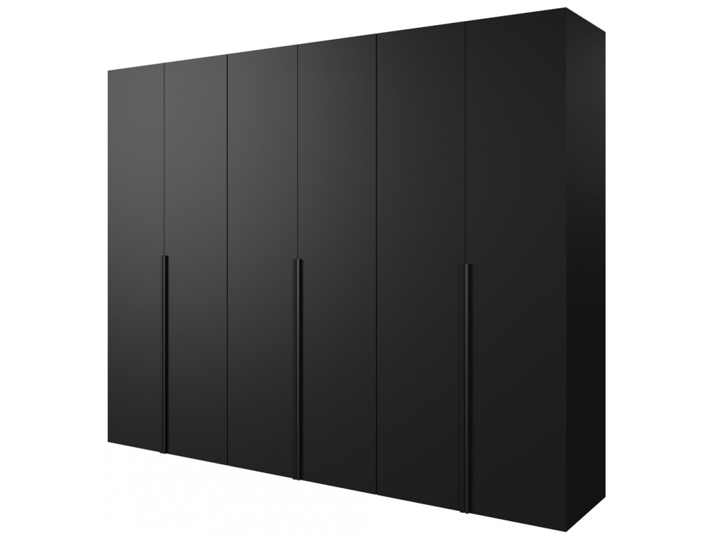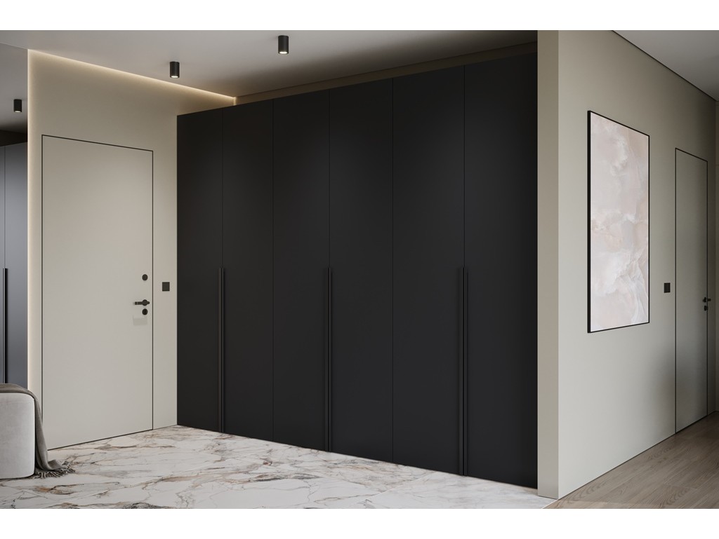 Szafa modułowa Alba 300 cm 6D w kolorze czarnym z czarnymi uchwytami to największy moduł z kolekcji, oferujący pojemne wnętrze i praktyczne rozmieszczenie półek oraz drążków. Idealna do przestronnych sypialni i garderób, zapewnia wygodne przechowywanie ubrań i dodatków. Dostawa obejmuje paczki do samodzielnego montażu. ⟵Zobacz całą kolekcję szaf Alba