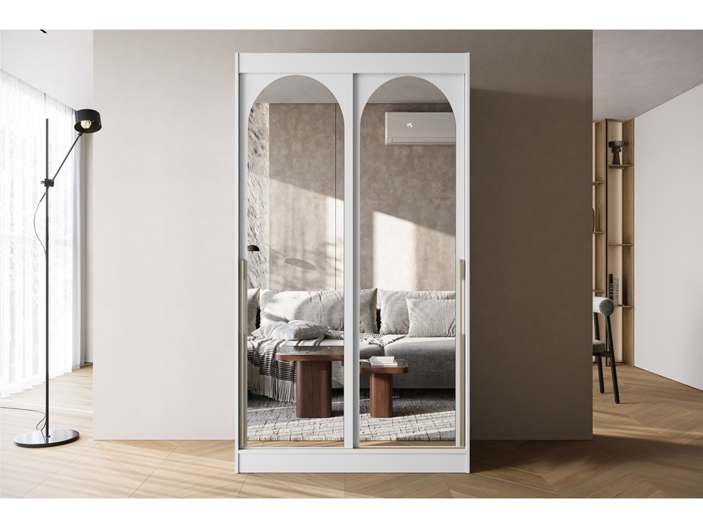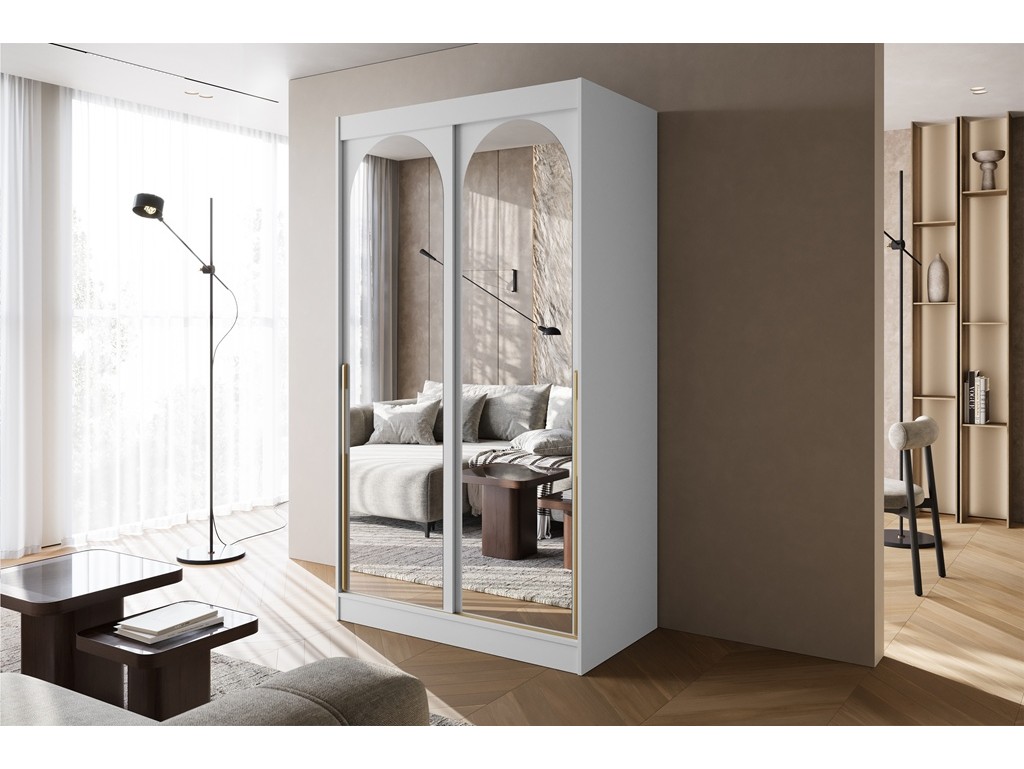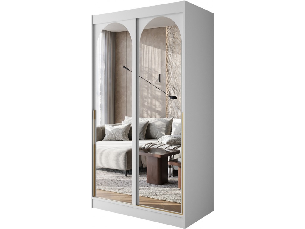 Szafa przesuwna Onli 120 w kolorze białym ze złotymi uchwytami to elegancki i funkcjonalny mebel do sypialni lub garderoby. Pojemne półki i drążek ułatwiają organizację ubrań, a zaokrąglone lustra na frontach optycznie powiększają przestrzeń. Minimalistyczny design z subtelnym złotym detalem tworzy stylowy akcent w każdym wnętrzu. ⟵Zobacz całą kolekcję szaf Onli
