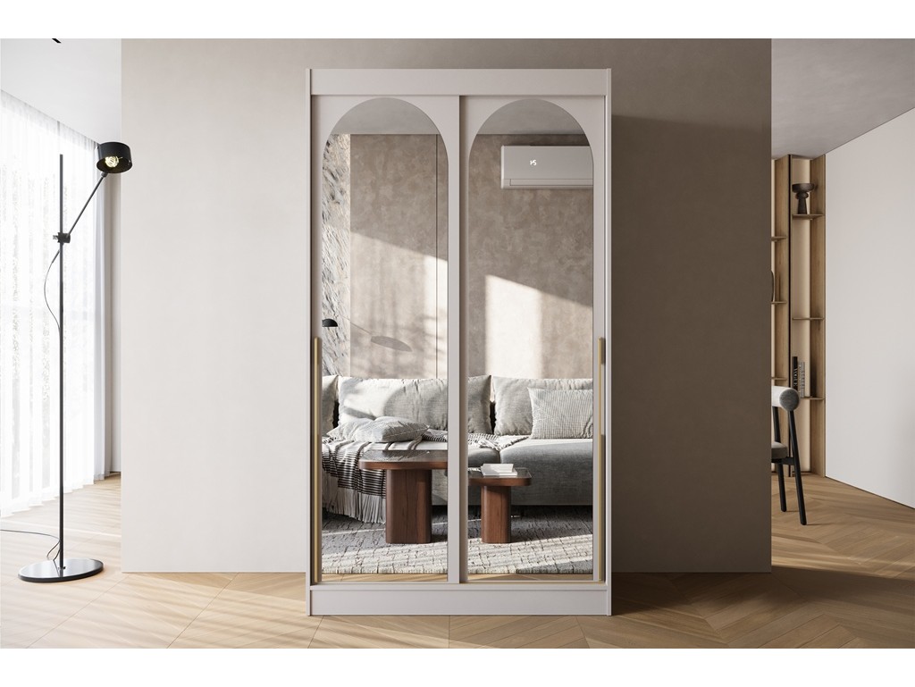 Szafa przesuwna Onli 120 kaszmir ze złotymi uchwytami łączy nowoczesną prostotę z subtelną elegancją. Zaokrąglone lustra na frontach dodają lekkości, a jasny odcień kaszmiru ociepla wnętrze. Wnętrze szafy z półkami i drążkiem umożliwia wygodne przechowywanie odzieży. ⟵Zobacz całą kolekcję szaf Onli