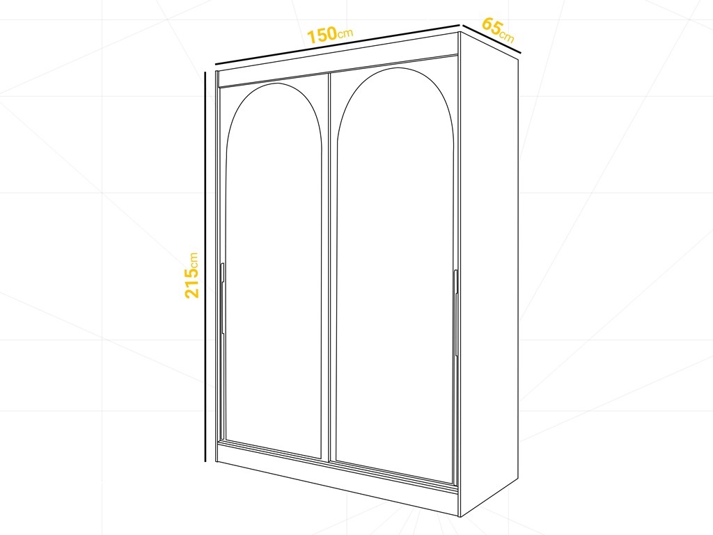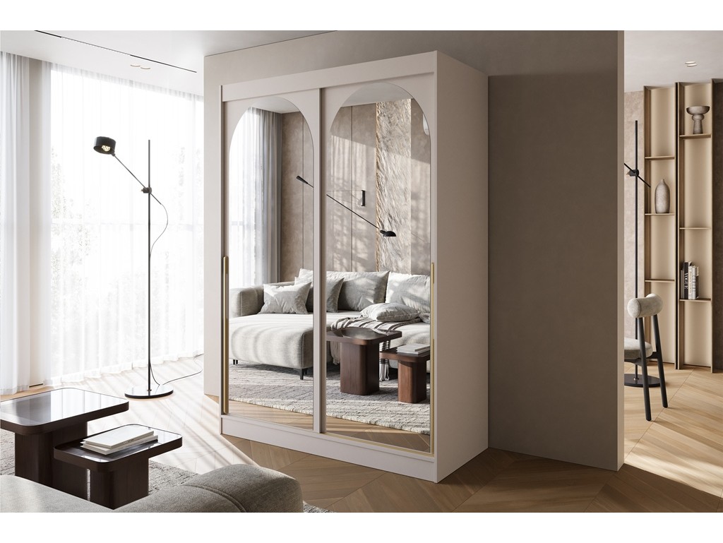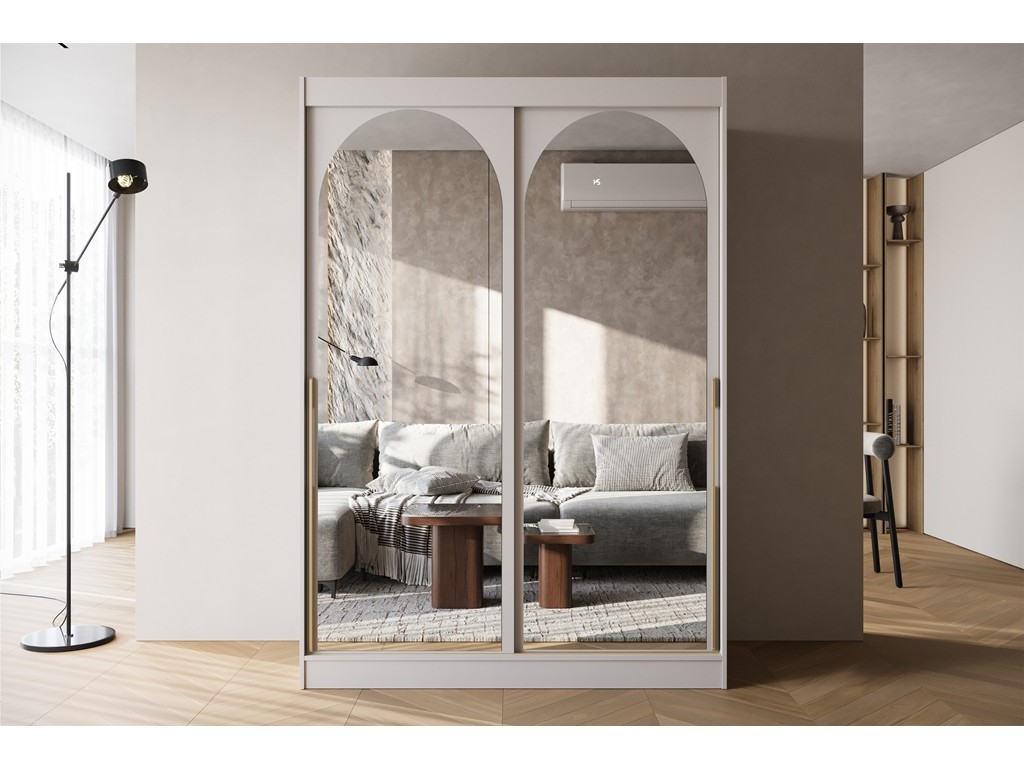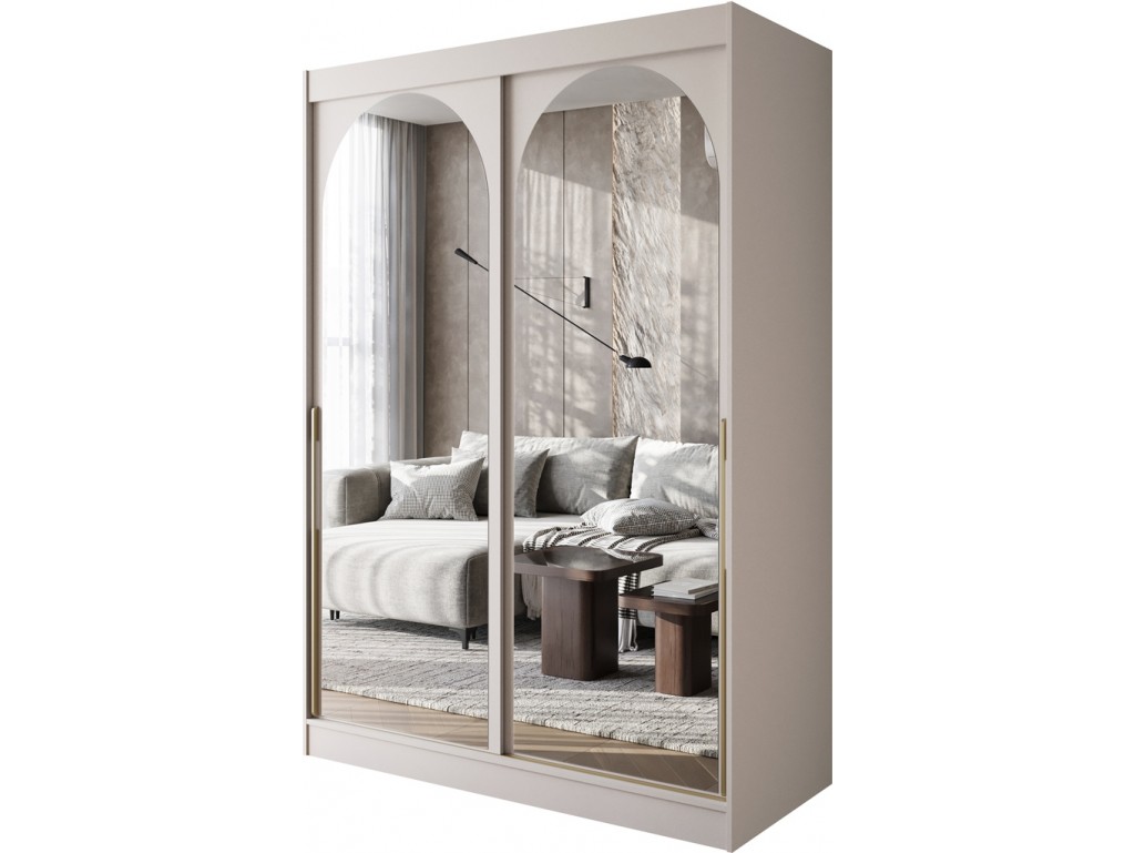 Szafa przesuwna Onli 150 w odcieniu kaszmir ze złotymi uchwytami łączy elegancję z funkcjonalnością. Model wyposażono w zaokrąglone lustra, które optycznie powiększają wnętrze i subtelnie odbijają światło. Duża pojemność oraz harmonijna kolorystyka sprawiają, że mebel pasuje do nowoczesnych i spokojnych aranżacji.