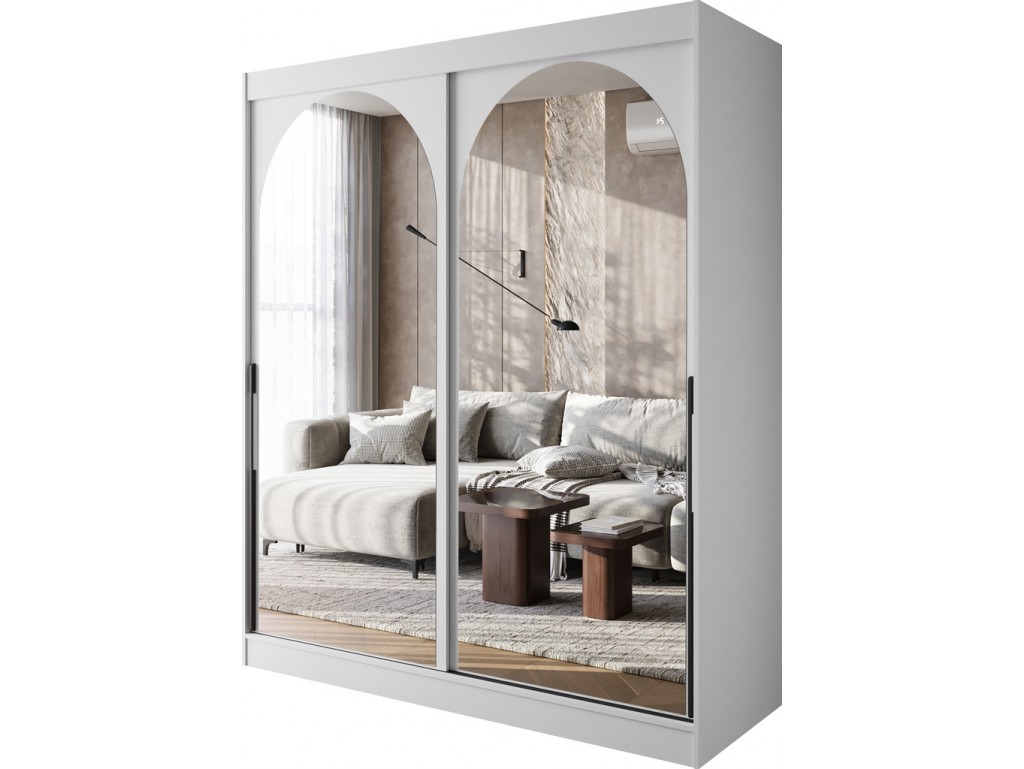 Szafa przesuwna Onli 180 w kolorze białym z czarnymi uchwytami to nowoczesny mebel do sypialni lub garderoby. Zaokrąglone lustra na frontach optycznie powiększają przestrzeń, a pojemne wnętrze z półkami i drążkiem zapewnia wygodne przechowywanie odzieży i dodatków. System LAGUNA umożliwia płynne przesuwanie drzwi i komfort codziennego użytkowania. ⟵Zobacz całą kolekcję szaf Onli