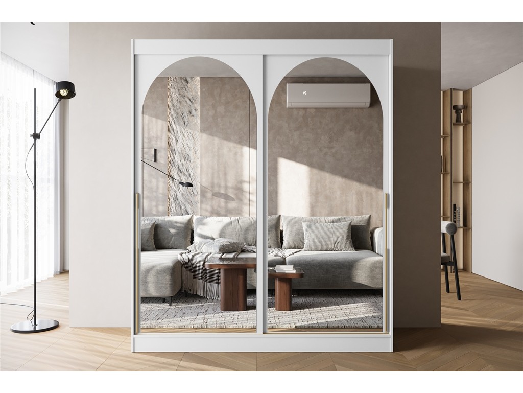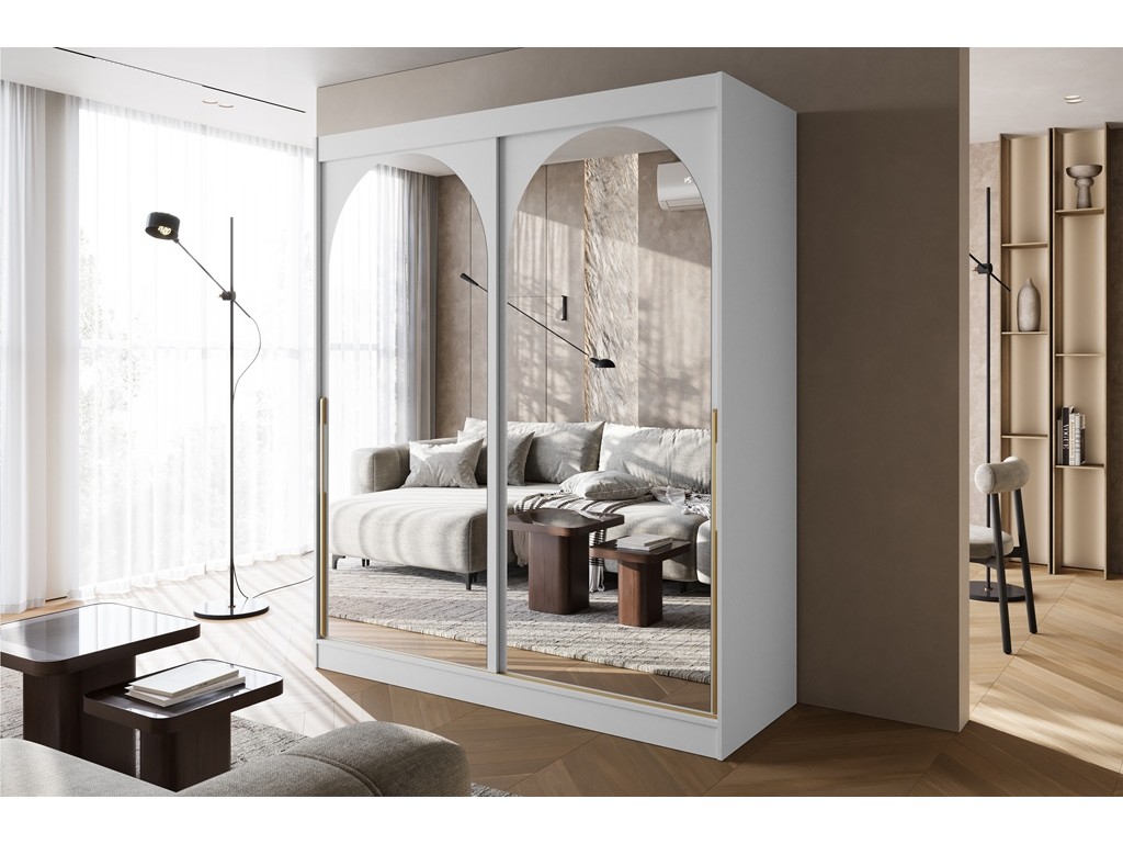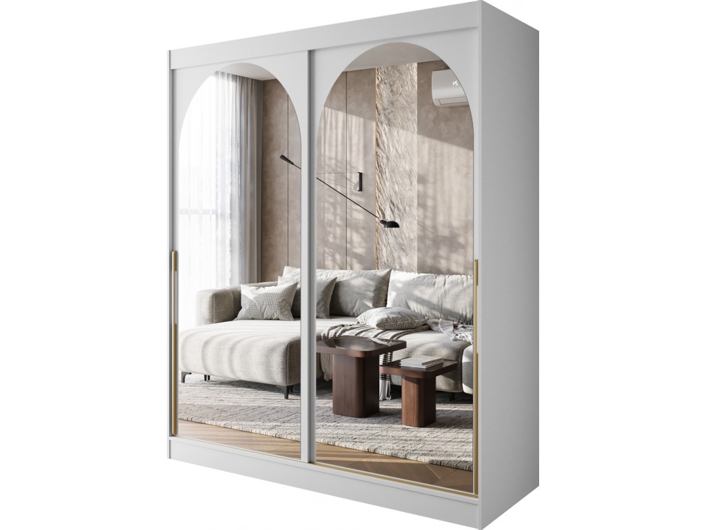 Szafa przesuwna Onli 180 biała ze złotymi uchwytami łączy minimalistyczną formę z subtelnym, eleganckim detalem. Zaokrąglone lustra optycznie powiększają przestrzeń, a szeroka bryła zwiększa pojemność wnętrza. Model sprawdzi się w sypialni, garderobie lub przedpokoju, oferując komfortową organizację odzieży.