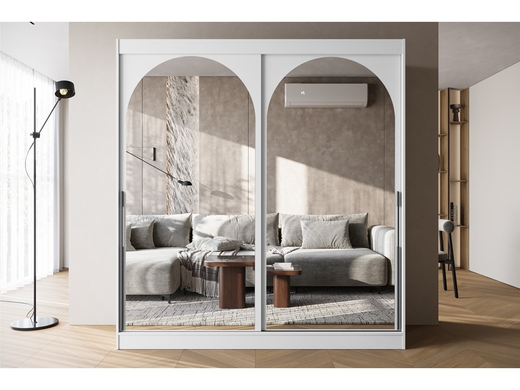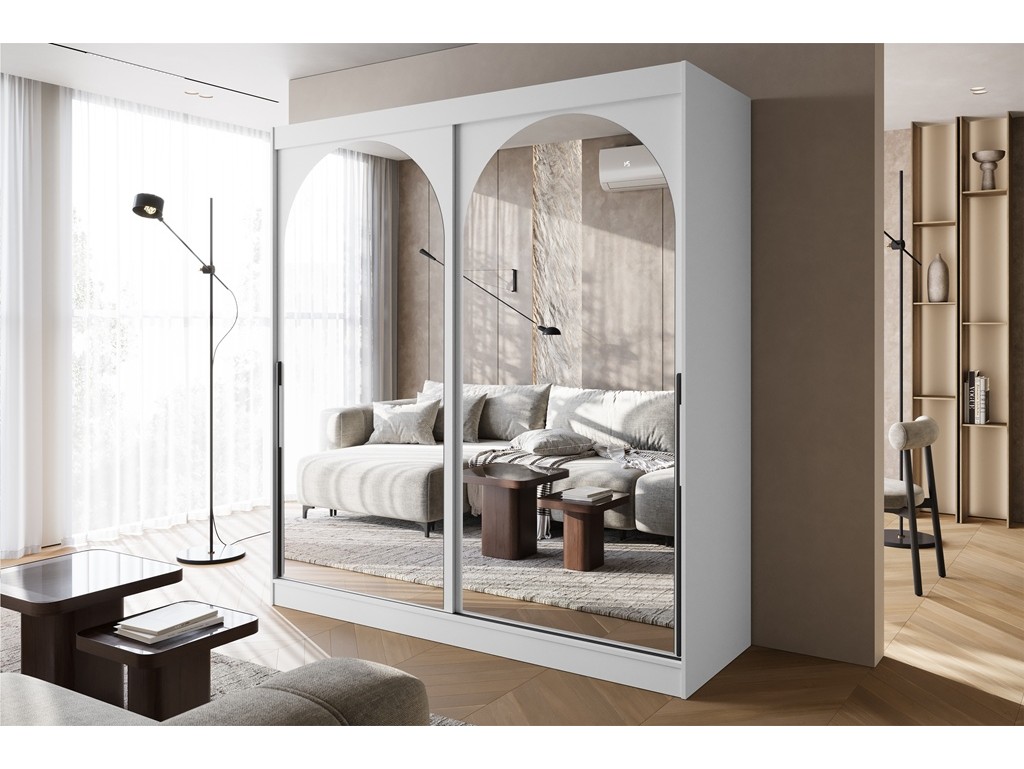 Szafa przesuwna Onli 200 biała z czarnymi uchwytami to największy model z serii Onli, pełniący funkcję domowej garderoby. Jasny kolor rozświetla wnętrze, a subtelnie zaokrąglone lustra dodają lekkości mimo dużego gabarytu. Kontrastujące uchwyty tworzą nowoczesny akcent, a mebel pozwala zachować pełną organizację odzieży, tekstyliów i dodatków. Dostawa w 5-12 dni, bez wniesienia.