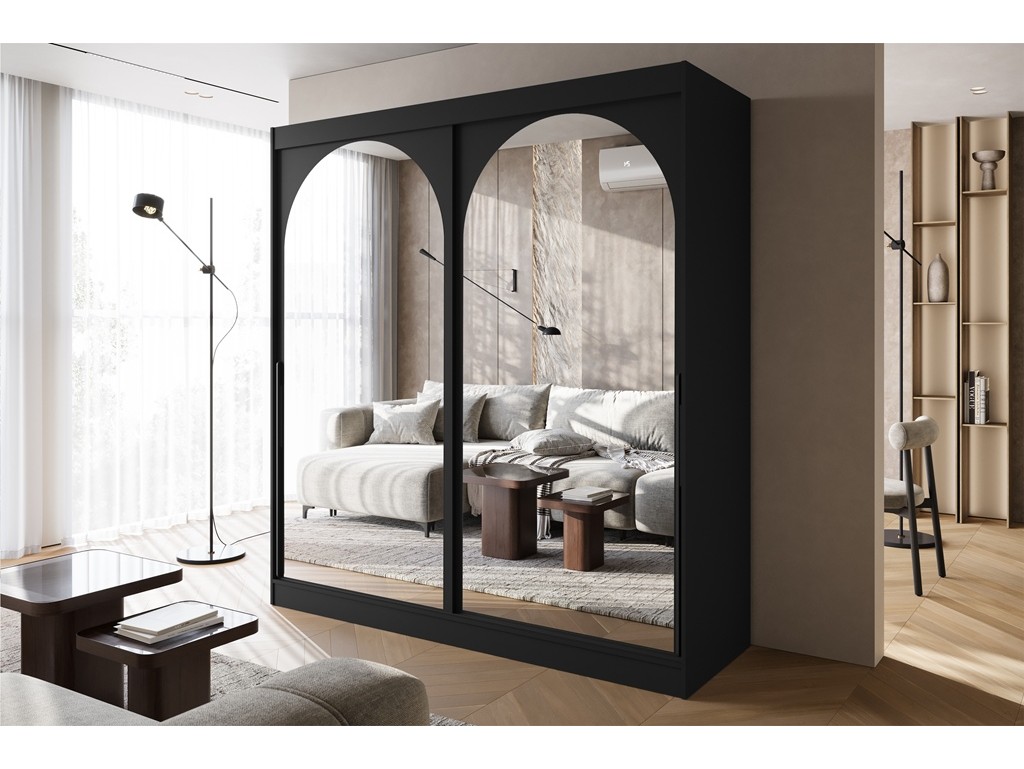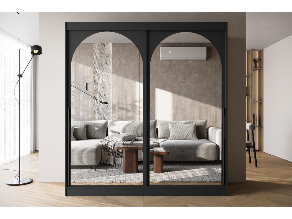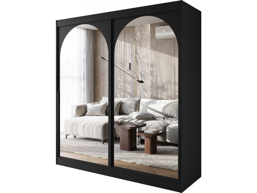 Szafa przesuwna Onli 200 czarna z czarnymi uchwytami to elegancki i funkcjonalny mebel do nowoczesnej sypialni. Zaokrąglone lustra optycznie powiększają przestrzeń, a przestronne wnętrze z półkami i drążkiem umożliwia wygodne przechowywanie ubrań i dodatków. Minimalistyczna forma harmonijnie komponuje się z klasycznymi i nowoczesnymi wnętrzami.⟵Zobacz całą kolekcję szaf Onli