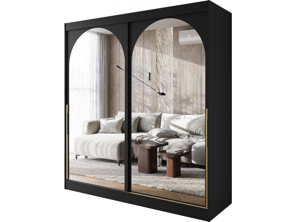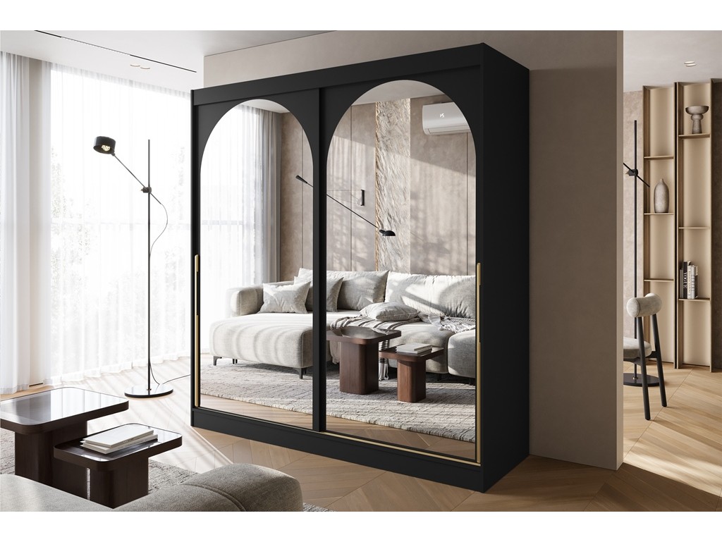 Szafa przesuwna Onli 200 czarna ze złotymi uchwytami łączy elegancję z praktycznością. Duże lustra i pojemne wnętrze ułatwiają codzienne przygotowania, a minimalistyczny design z subtelnym akcentem złota sprawdza się w sypialni, garderobie lub pokoju gościnnym. Dostawa w 5-12 dni.⟵Zobacz całą kolekcję szaf Onli