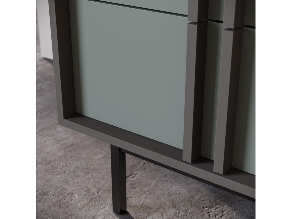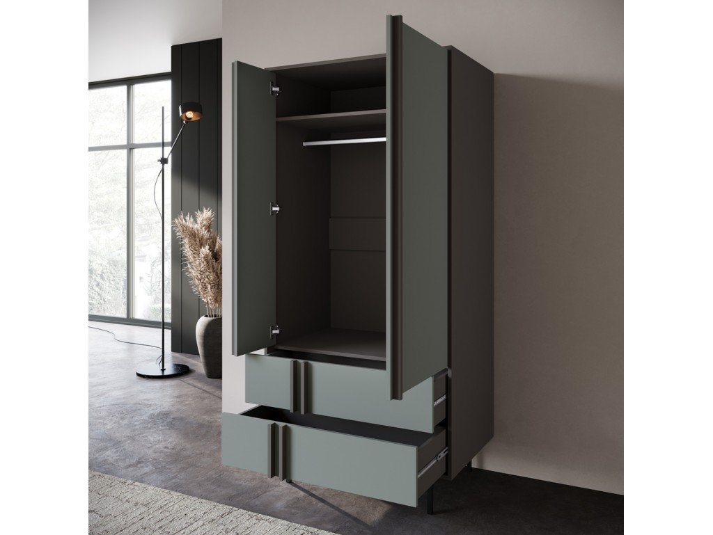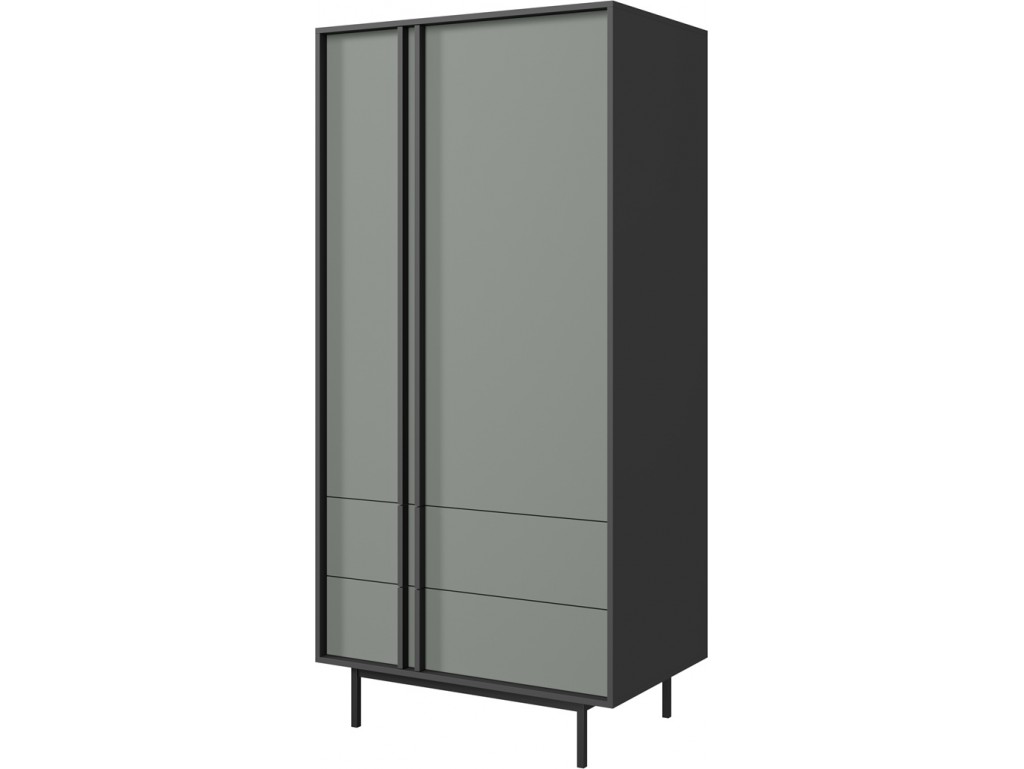 Szafa uchylna Vlog 1 w kolorze antracyt z frontami aloes to elegancka i funkcjonalna szafa do nowoczesnej sypialni lub pokoju. Pojemne półki i szuflady ułatwiają przechowywanie odzieży, a minimalistyczne uchwyty i stabilne metalowe nogi dodają meblowi nowoczesnego charakteru. Produkt dostępny z szybką dostawą i możliwością łatwego montażu. ⟵Zobacz całą kolekcję szaf Vlog