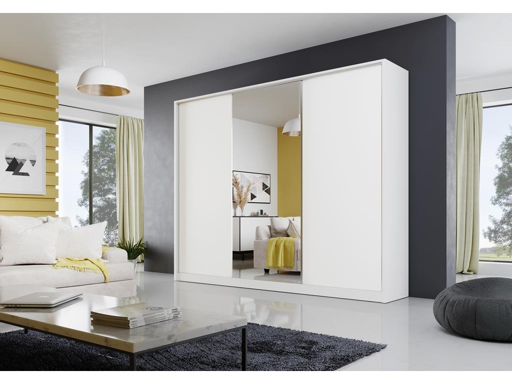 Szafa Meblo 1 w rozmiarze 270 cm w odcieniu biały mat to nowoczesny i uniwersalny model, który pasuje do wnętrz minimalistycznych, skandynawskich i klasycznych. Centralne lustro optycznie powiększa przestrzeń, a drzwi przesuwne ułatwiają dostęp do funkcjonalnego wnętrza z półkami i drążkiem. Jasny matowy kolor nadaje lekkości, tworząc praktyczne i harmonijne miejsce przechowywania.