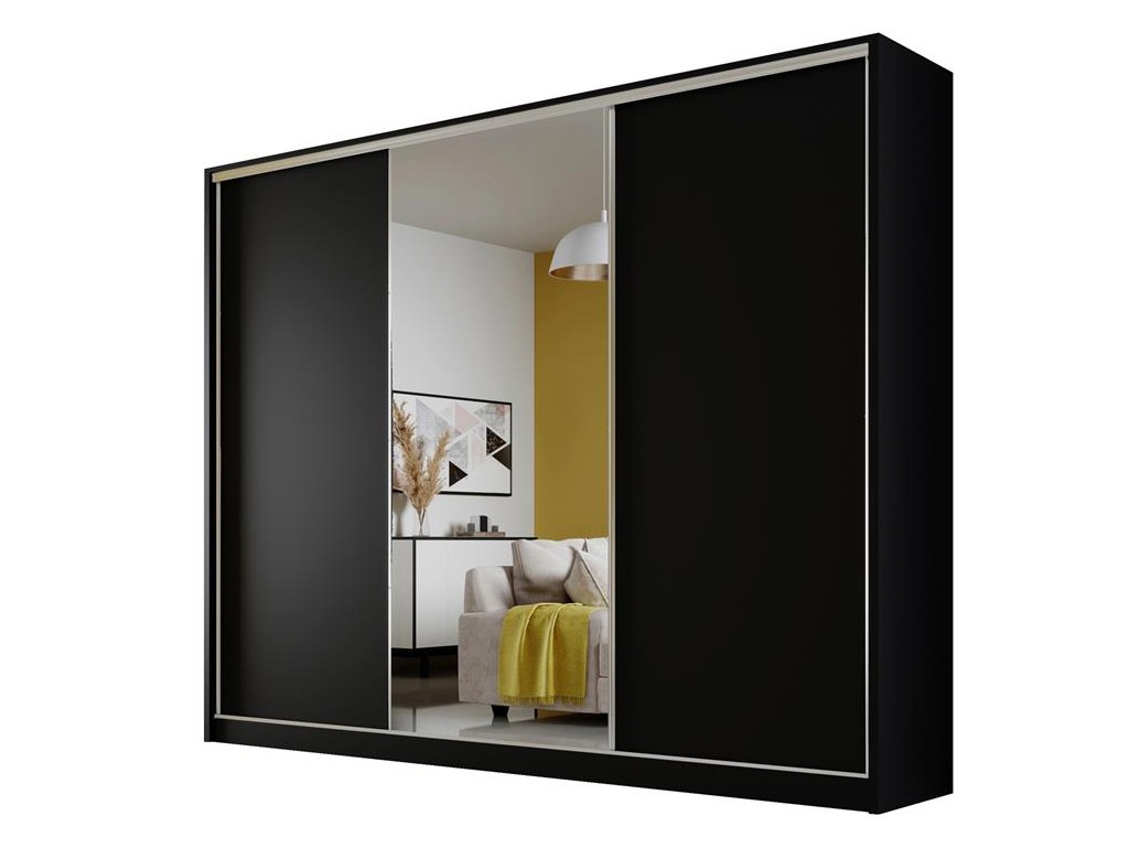 Szafa Meblo 1 w rozmiarze 270 cm w kolorze czarny mat to nowoczesna i elegancka propozycja do sypialni oraz garderoby. Gładkie matowe fronty zestawione z centralnym lustrem podkreślają minimalistyczny charakter wnętrza, a trzydrzwiowa konstrukcja zapewnia wygodny dostęp do przestronnego układu półek i drążków. Model sprawdzi się idealnie jako pojemna szafa dla dwojga, oferując funkcjonalną organizację ubrań na co dzień.