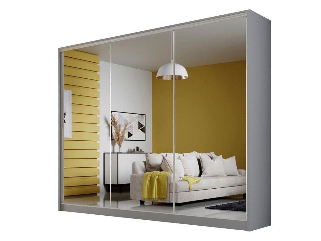 Szafa Meblo 2 w rozmiarze 270 cm w kolorze szary mat to nowoczesna szafa przesuwna dla par, łącząca pojemne wnętrze z funkcjonalnymi rozwiązaniami. Lustrzane fronty optycznie powiększają przestrzeń i wprowadzają więcej światła. Model zapewnia wygodną organizację ubrań dzięki półkom, przegrodom i drążkowi, a uchwyty listwowe w chromie nadają minimalistyczny charakter.