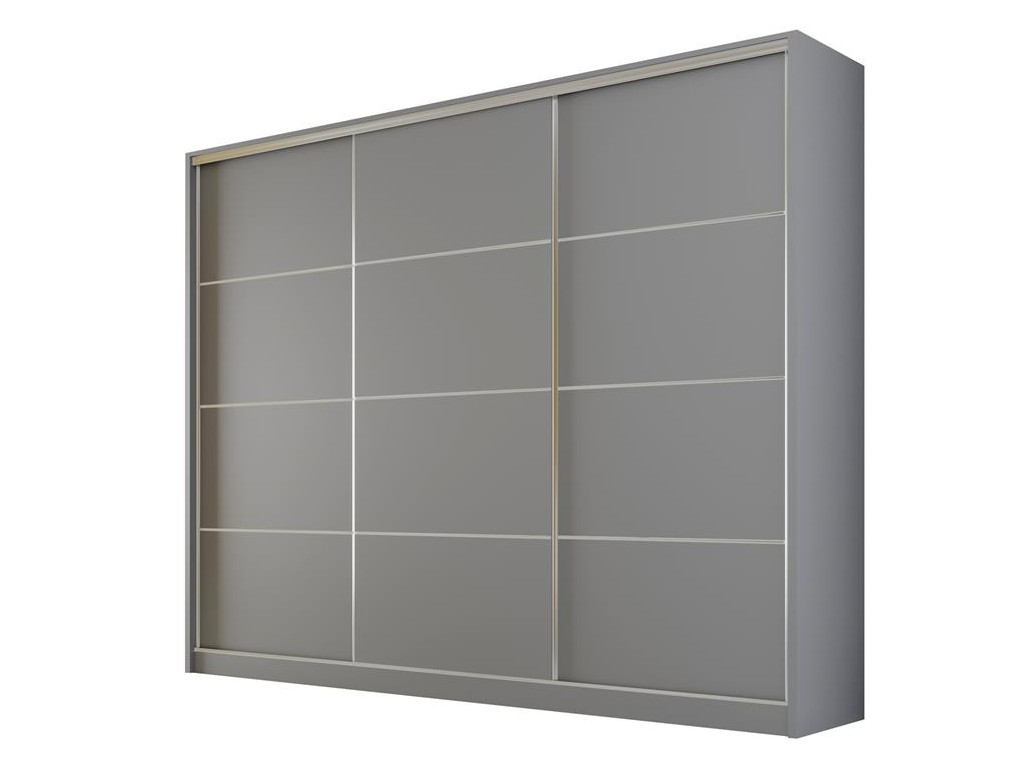 Szafa Meblo 3 w rozmiarze 270 cm i neutralnym kolorze szary mat to nowoczesny mebel z trzema drzwiami przesuwnymi, który łączy minimalistyczny design z wysoką funkcjonalnością. Gładkie fronty z chromowanymi szprosami wprowadzają subtelną elegancję, a przestronne wnętrze z przegrodami, półkami i drążkiem umożliwia wygodną organizację garderoby.