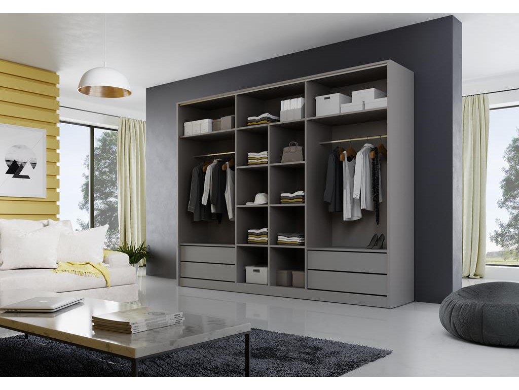Szary mat sprawia, że szafa harmonijnie komponuje się z wnętrzami nowoczesnymi, loftowymi i skandynawskimi.
