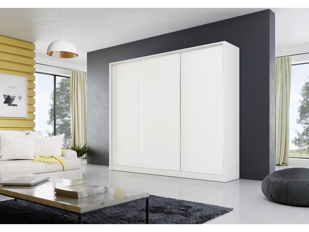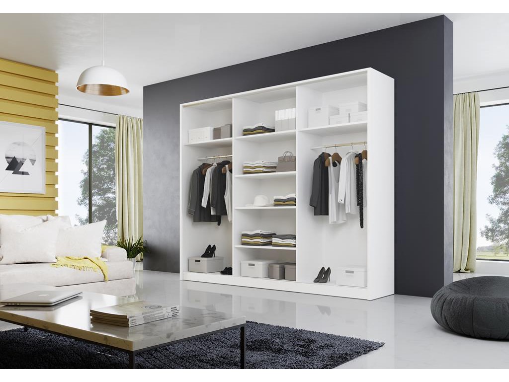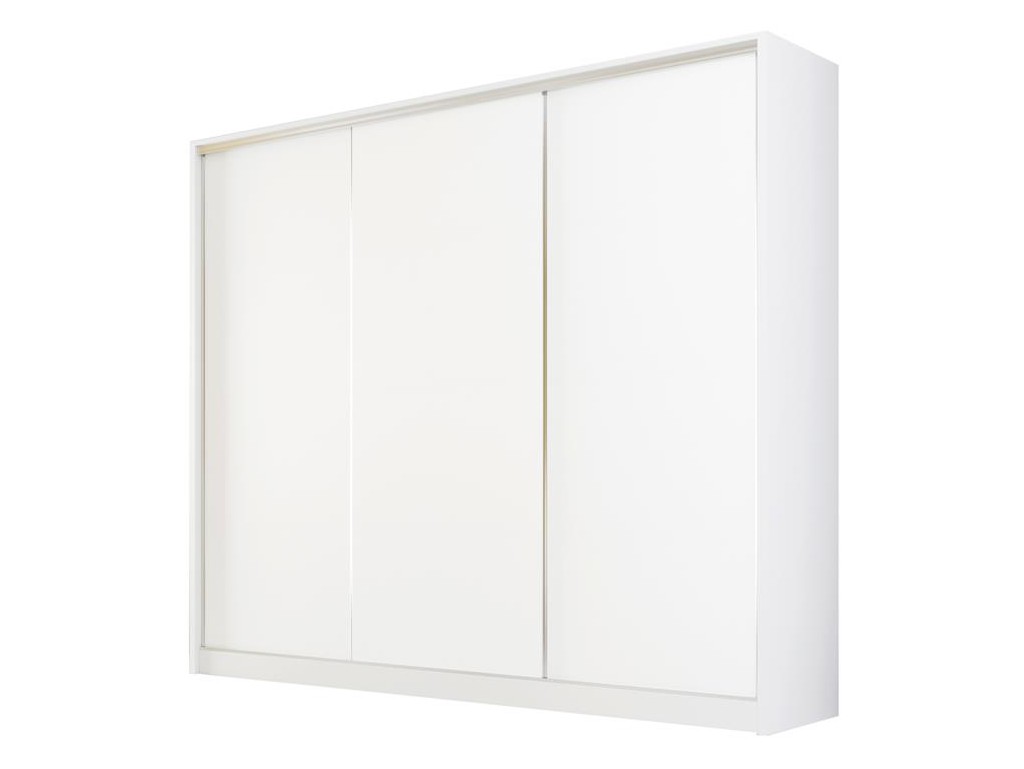 Szafa przesuwna Meblo w rozmiarze 250 cm w kolorze biały mat to jasny, minimalistyczny mebel do nowoczesnego wnętrza. Troje drzwi przesuwnych w systemie Laguna zapewnia stabilną i cichą pracę, a pojemne wnętrze z półkami pionowymi, przegrodami i drążkiem umożliwia wygodne przechowywanie garderoby. Szerokość 250 cm gwarantuje maksymalną funkcjonalność i komfort codziennego użytkowania.