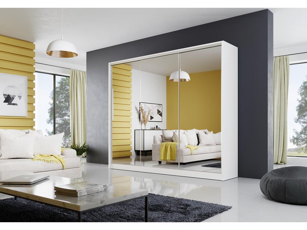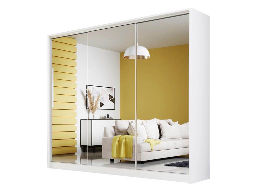 Szafa przesuwna Meblo 2 w rozmiarze 250 cm w kolorze biały mat to nowoczesny model z lustrzanymi frontami, który optycznie powiększa wnętrze i wprowadza poczucie przestronności. Drzwi przesuwne ułatwiają dostęp do obszernego wnętrza z półkami, przegrodami i drążkiem. Biały mat świetnie komponuje się z minimalistycznymi i jasnymi pomieszczeniami.