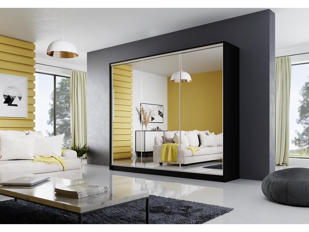 Szafa przesuwna Meblo 2 w rozmiarze 250 cm w kolorze czarny mat to nowoczesny i stylowy model z lustrzanymi frontami, który nadaje wnętrzu wyrazisty charakter. Lustra na wszystkich trzech frontach optycznie powiększają przestrzeń, a trzy drzwi przesuwne umożliwiają wygodny dostęp do obszernego wnętrza z półkami pionowymi, przegrodami oraz drążkiem na ubrania. Model o szerokości 250 cm zapewnia maksymalną pojemność i komfort codziennego użytkowania.