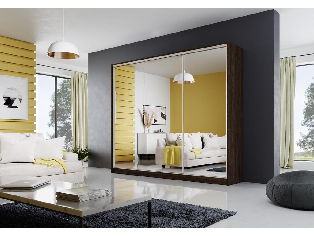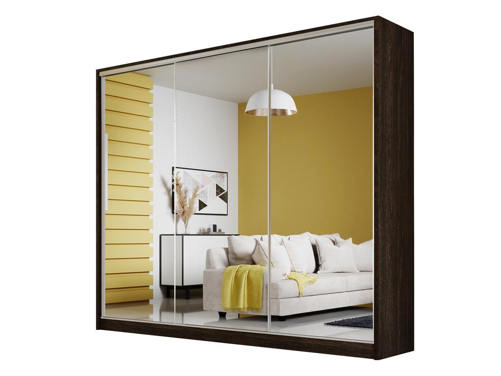 Szafa przesuwna Meblo 2 w rozmiarze 250 cm w kolorze wenge to elegancki i pojemny mebel do nowoczesnej sypialni. Trzy drzwi przesuwne z lustrzanymi frontami optycznie powiększają przestrzeń, a ciepły odcień wenge harmonizuje z ciemnymi i naturalnymi dekorami. Dostawa w Polsce jest bezpłatna.