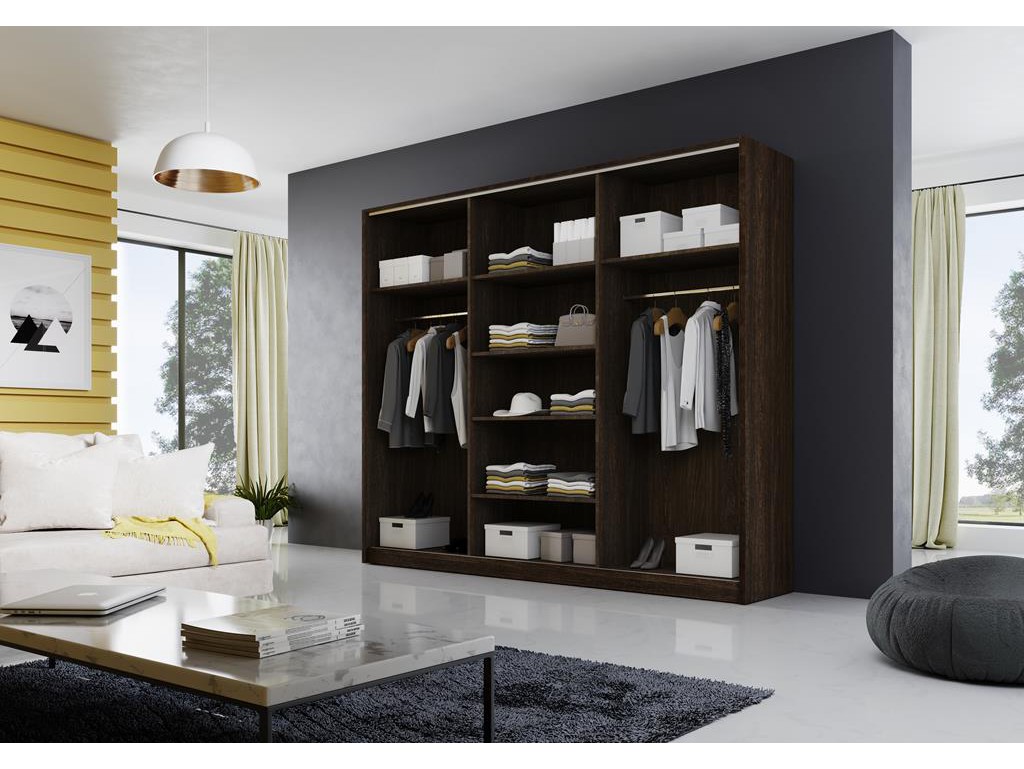 Trzyskrzydłowe drzwi przesuwne umożliwiają łatwy dostęp do wszystkich części szafy, a pojemne wnętrze pozwala na wygodne przechowywanie odzieży i akcesoriów.